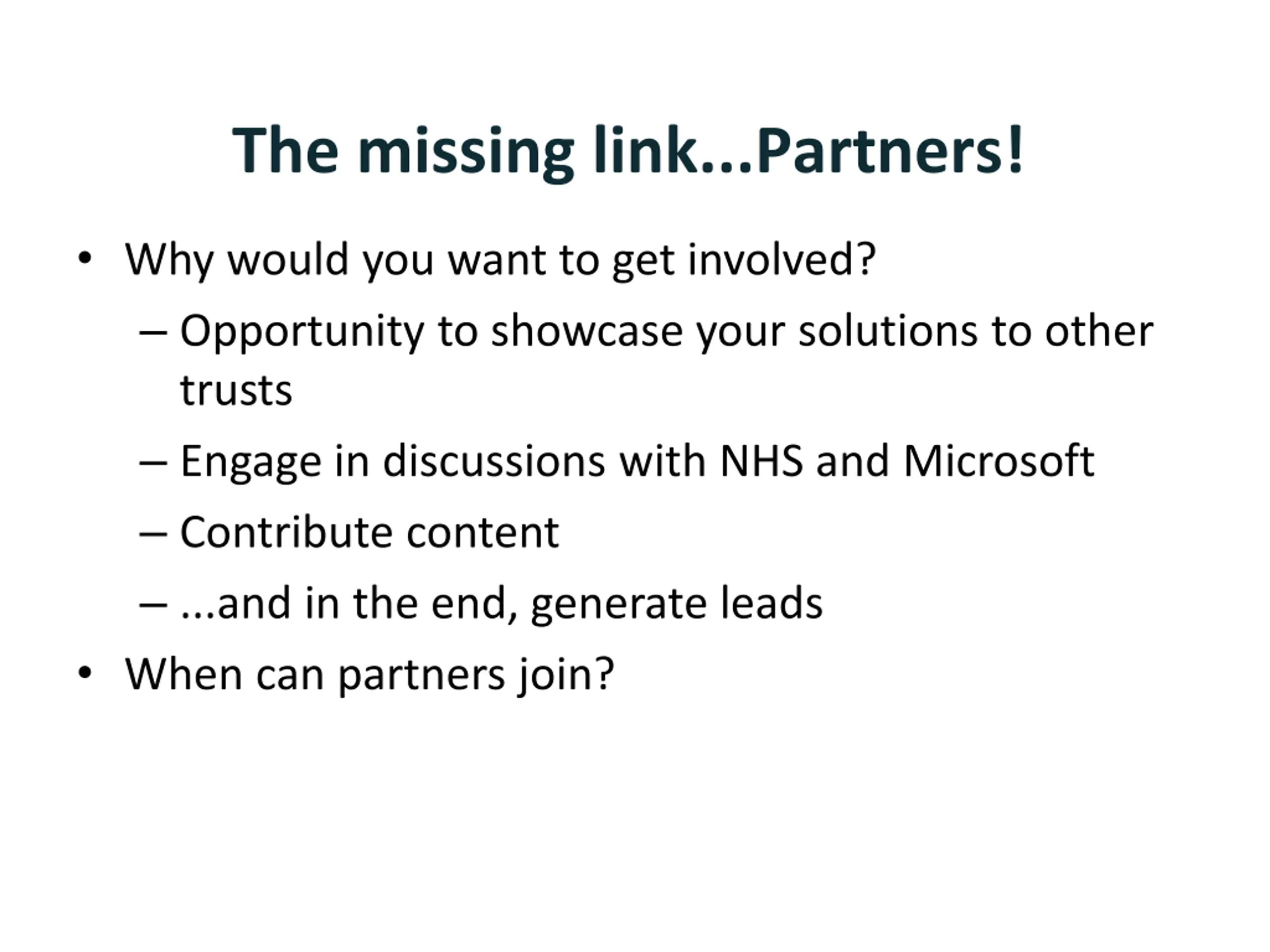 The missing link...Partners! Why would you want to get involved? Opportunity to showcase your solutions to other trusts Engage in discussions with NHS and Microsoft Contribute content ...and in the end, generate leads When can partners join?
