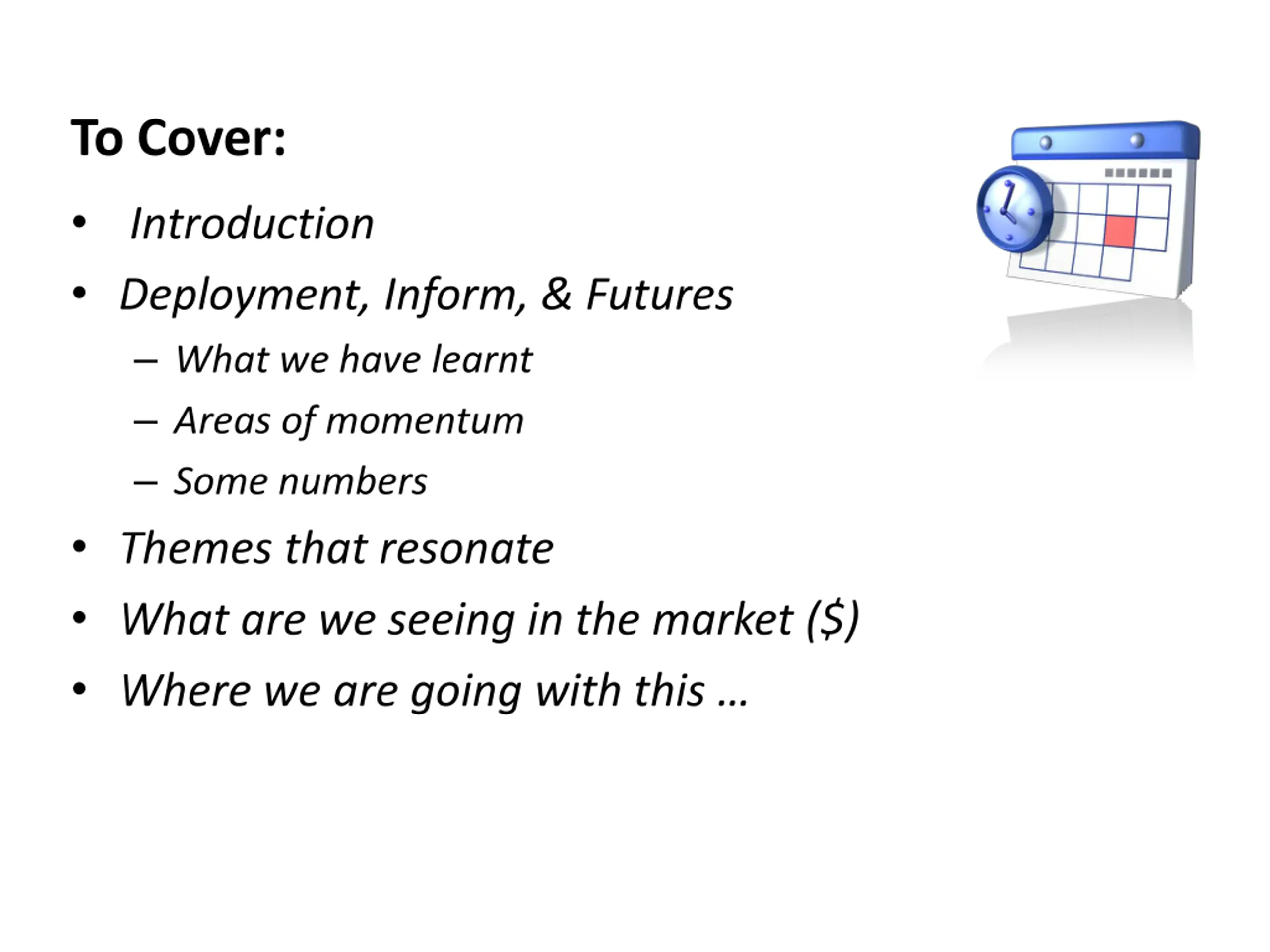 To Cover: Introduction Deployment, Inform, & Futures What we have learnt Areas of momentum Some numbers Themes that resonate What are we seeing in the market ($) Where we are going with this