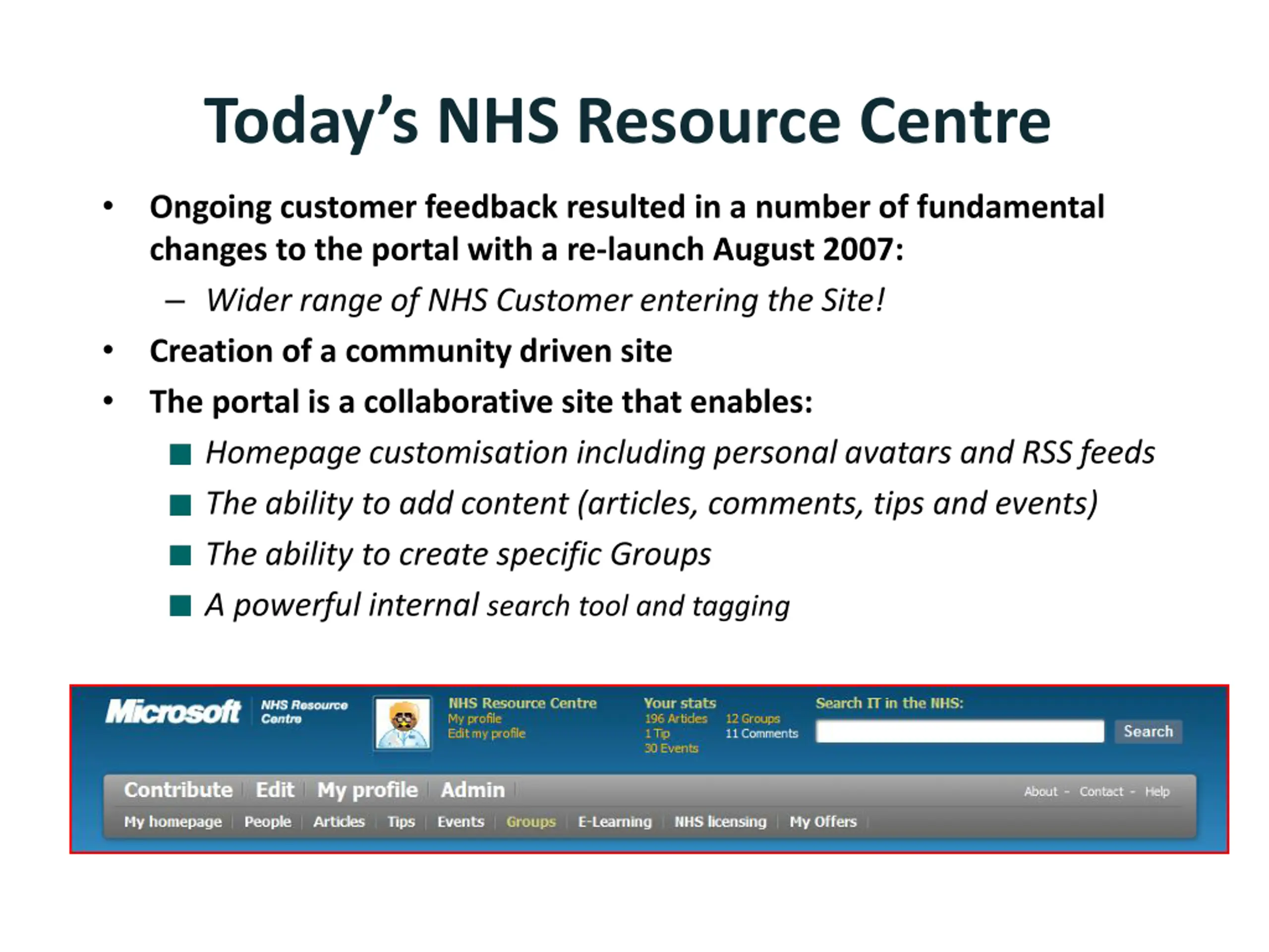 Todays NHS Resource Centre Ongoing customer feedback resulted in a number of fundamental changes to the portal with a re-launch August 2007: Wider range of NHS Customer entering the Site! Creation of a community driven site The portal is a collaborative site that enables: Homepage customisation including personal avatars and RSS feeds The ability to add content (articles, comments, tips and events) The ability to create specific Groups A powerful internal search tool and tagging