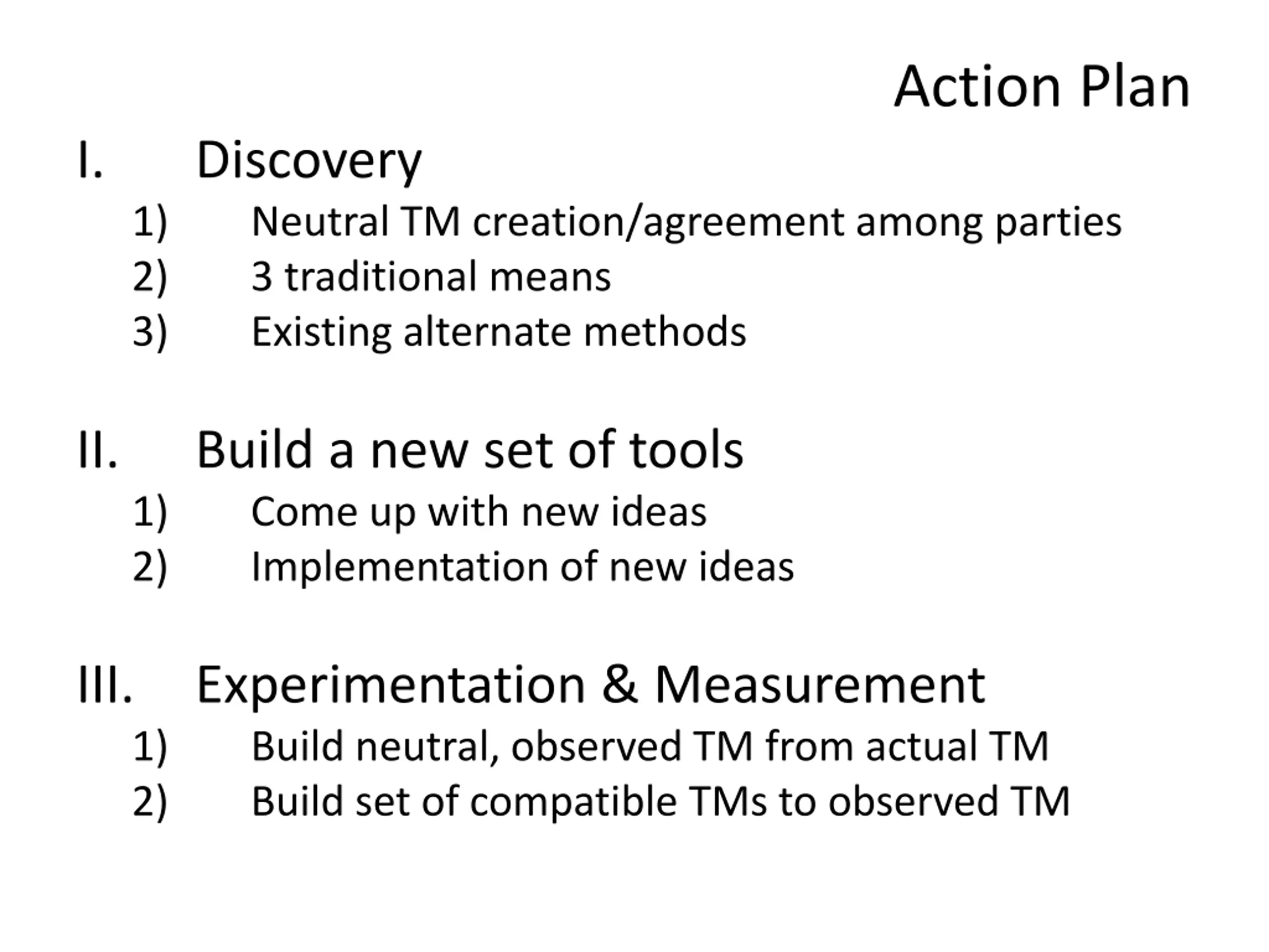 Action Plan I. Discovery Neutral TM creation/agreement among parties 3 traditional means Existing alternate methods 1) 2) 3) II. Build a new set of tools Come up with new ideas Implementation of new ideas 1) 2) III. Experimentation & Measurement Build neutral, observed TM from actual TM Build set of compatible TMs to observed TM 1) 2)