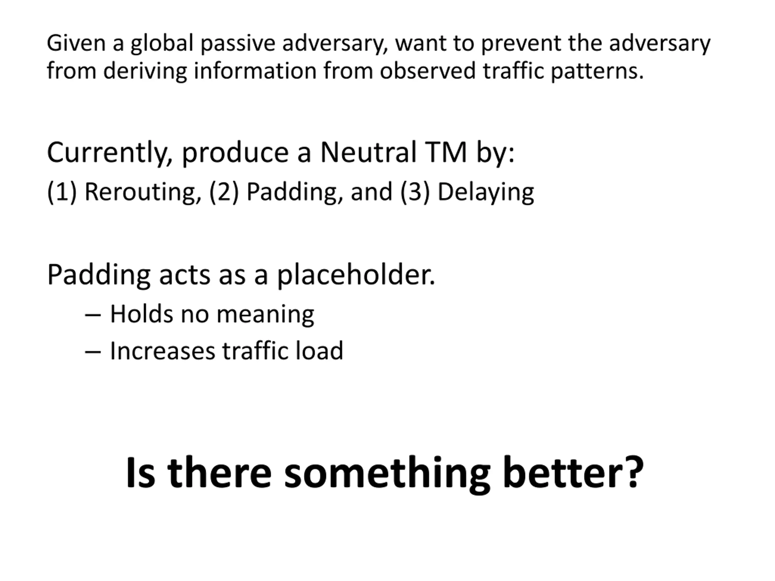 Given a global passive adversary, want to prevent the adversary from deriving information from observed traffic patterns. Currently, produce a Neutral TM by: (1) Rerouting, (2) Padding, and (3) Delaying Padding acts as a placeholder. Holds no meaning Increases traffic load Is there something better?