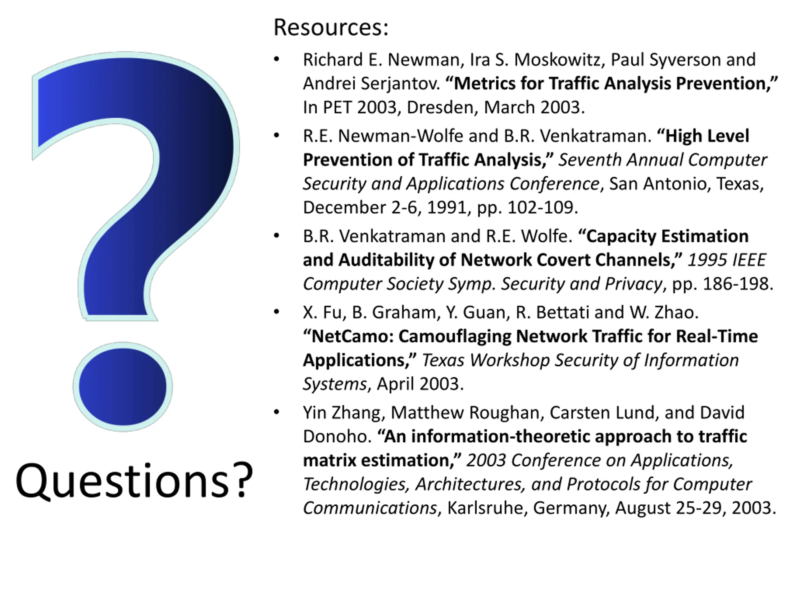 Resources: Richard E. Newman, Ira S. Moskowitz, Paul Syverson and Andrei Serjantov. Metrics for Traffic Analysis Prevention, In PET 2003, Dresden, March 2003. R.E. Newman-Wolfe and B.R. Venkatraman. High Level Prevention of Traffic Analysis, Seventh Annual Computer Security and Applications Conference, San Antonio, Texas, December 2-6, 1991, pp. 102-109. B.R. Venkatraman and R.E. Wolfe. Capacity Estimation and Auditability of Network Covert Channels, 1995 IEEE Computer Society Symp. Security and Privacy, pp. 186-198. X. Fu, B. Graham, Y. Guan, R. Bettati and W. Zhao. NetCamo: Camouflaging Network Traffic for Real-Time Applications, Texas Workshop Security of Information Systems, April 2003. Yin Zhang, Matthew Roughan, Carsten Lund, and David Donoho. An information-theoretic approach to traffic matrix estimation, 2003 Conference on Applications, Technologies, Architectures, and Protocols for Computer Communications, Karlsruhe, Germany, August 25-29, 2003. Questions?