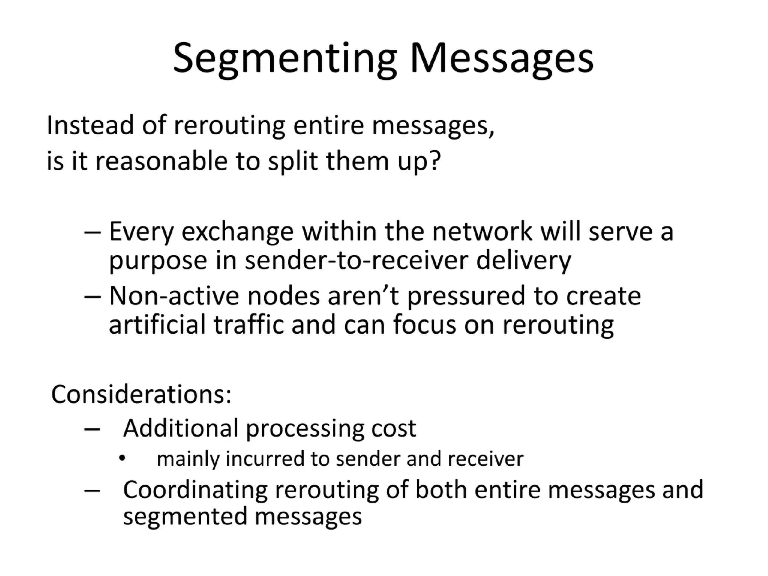 Segmenting Messages Instead of rerouting entire messages, is it reasonable to split them up? Every exchange within the network will serve a purpose in sender-to-receiver delivery Non-active nodes aren t pressured to create artificial traffic and can focus on rerouting Considerations: Additional processing cost mainly incurred to sender and receiver Coordinating rerouting of both entire messages and segmented messages