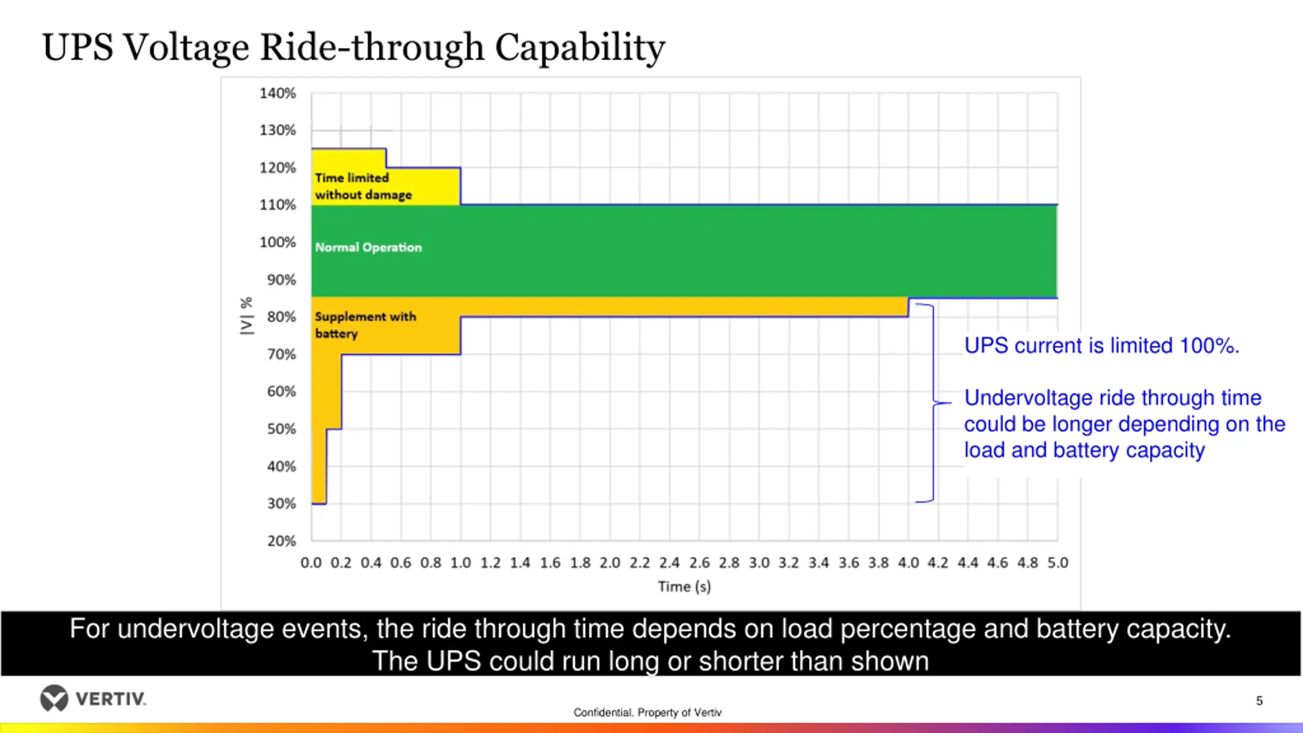 UPS Voltage Ride-through Capability UPS current is limited 100%. Undervoltage ride through time could be longer depending on the load and battery capacity For undervoltage events, the ride through time depends on load percentage and battery capacity. The UPS could run long or shorter than shown 5 Confidential. Property of Vertiv