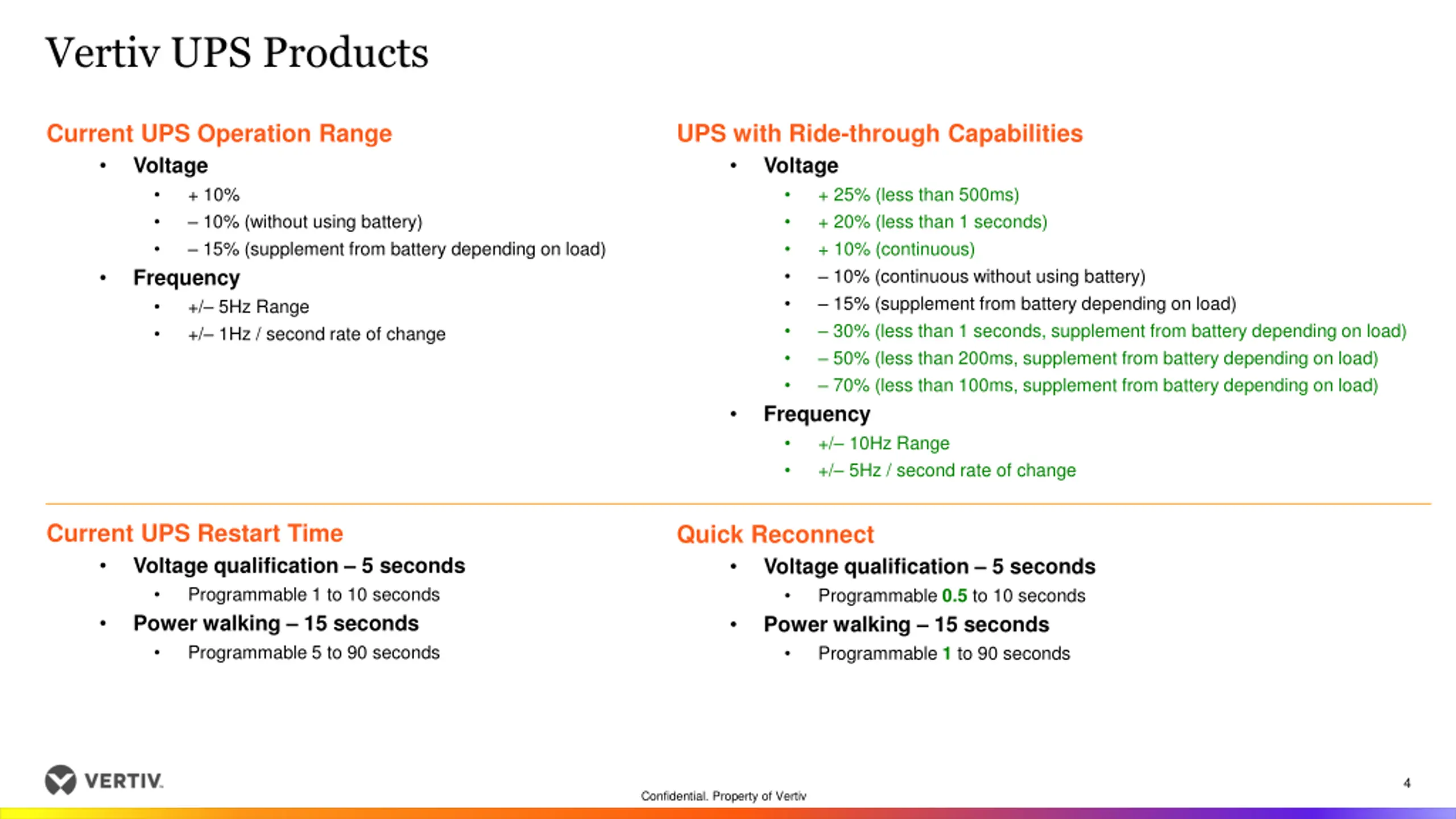 Vertiv UPS Products Current UPS Operation Range Voltage + 10% 10% (without using battery) 15% (supplement from battery depending on load) Frequency +/ 5Hz Range +/ 1Hz / second rate of change UPS with Ride-through Capabilities Voltage + 25% (less than 500ms) + 20% (less than 1 seconds) + 10% (continuous) 10% (continuous without using battery) 15% (supplement from battery depending on load) 30% (less than 1 seconds, supplement from battery depending on load) 50% (less than 200ms, supplement from battery depending on load) 70% (less than 100ms, supplement from battery depending on load) Frequency +/ 10Hz Range +/ 5Hz / second rate of change Current UPS Restart Time Voltage qualification 5 seconds Programmable 1 to 10 seconds Power walking 15 seconds Programmable 5 to 90 seconds Quick Reconnect Voltage qualification 5 seconds Programmable 0.5 to 10 seconds Power walking 15 seconds Programmable 1 to 90 seconds 4 Confidential. Property of Vertiv