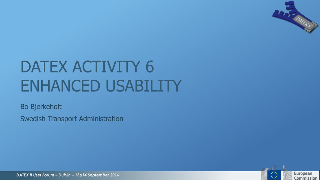 DATEX ACTIVITY 6 ENHANCED USABILITY Bo Bjerkeholt Swedish Transport Administration DATEX II User Forum Dublin 13&14 September 2016