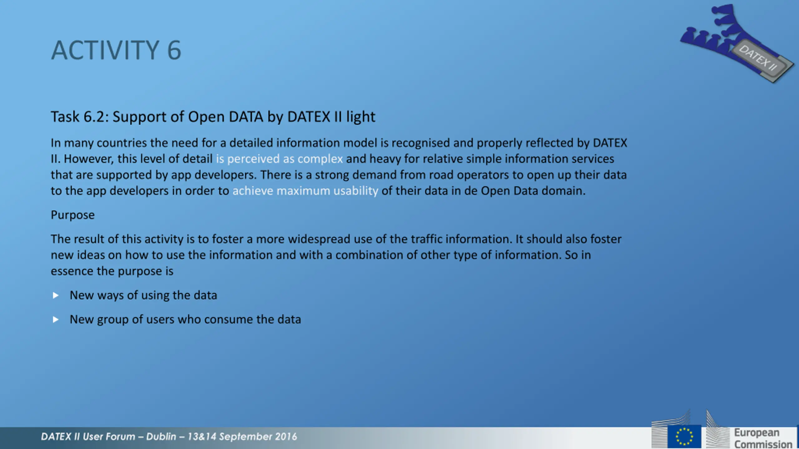 ACTIVITY 6 Task 6.2: Support of Open DATA by DATEX II light In many countries the need for a detailed information model is recognised and properly reflected by DATEX II. However, this level of detail is perceived as complex and heavy for relative simple information services that are supported by app developers. There is a strong demand from road operators to open up their data to the app developers in order to achieve maximum usability of their data in de Open Data domain. Purpose The result of this activity is to foster a more widespread use of the traffic information. It should also foster new ideas on how to use the information and with a combination of other type of information. So in essence the purpose is New ways of using the data New group of users who consume the data DATEX II User Forum Dublin 13&14 September 2016