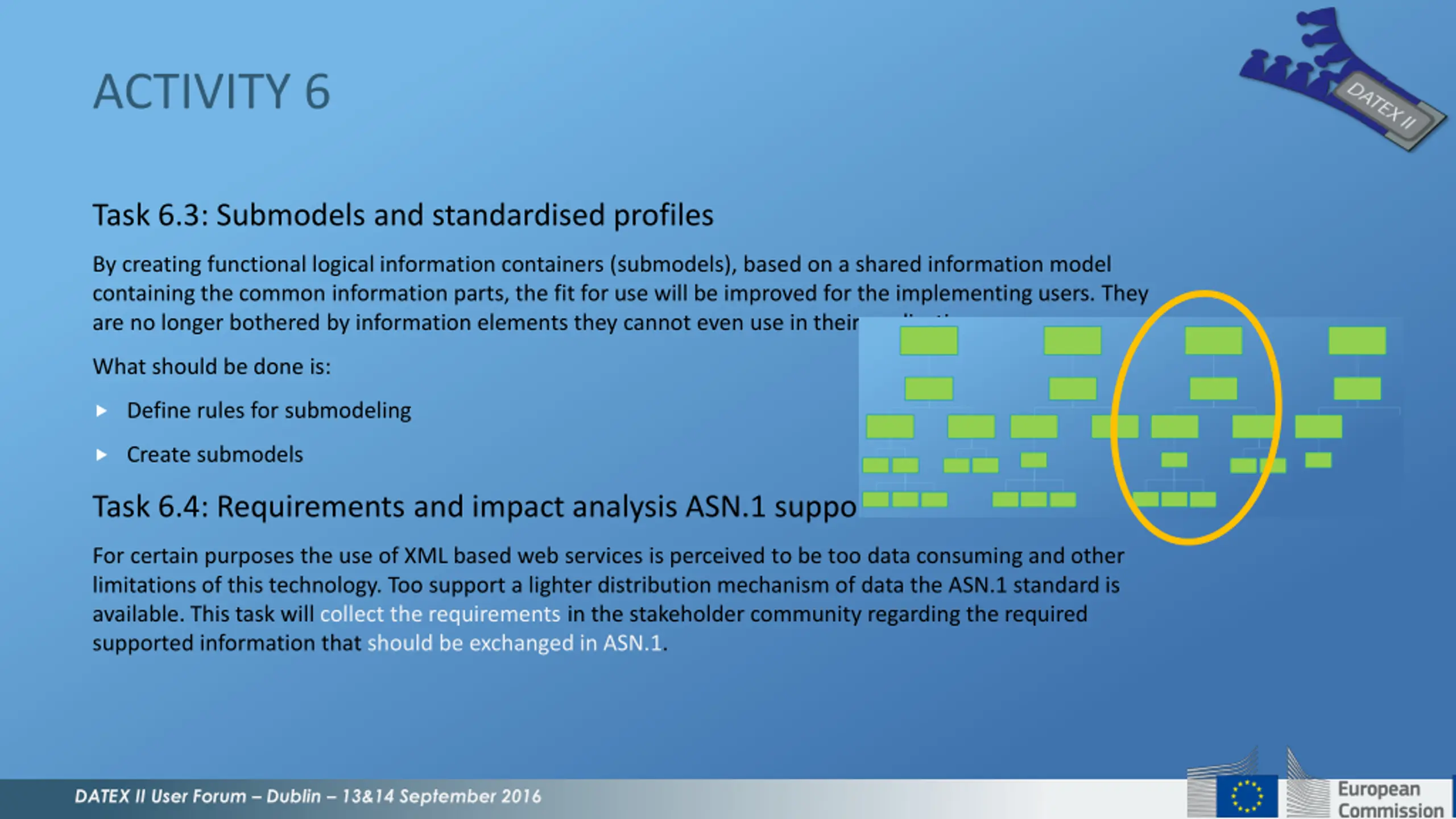 ACTIVITY 6 Task 6.3: Submodels and standardised profiles By creating functional logical information containers (submodels), based on a shared information model containing the common information parts, the fit for use will be improved for the implementing users. They are no longer bothered by information elements they cannot even use in their applications. What should be done is: Define rules for submodeling Create submodels Task 6.4: Requirements and impact analysis ASN.1 support For certain purposes the use of XML based web services is perceived to be too data consuming and other limitations of this technology. Too support a lighter distribution mechanism of data the ASN.1 standard is available. This task will collect the requirements in the stakeholder community regarding the required supported information that should be exchanged in ASN.1. DATEX II User Forum Dublin 13&14 September 2016