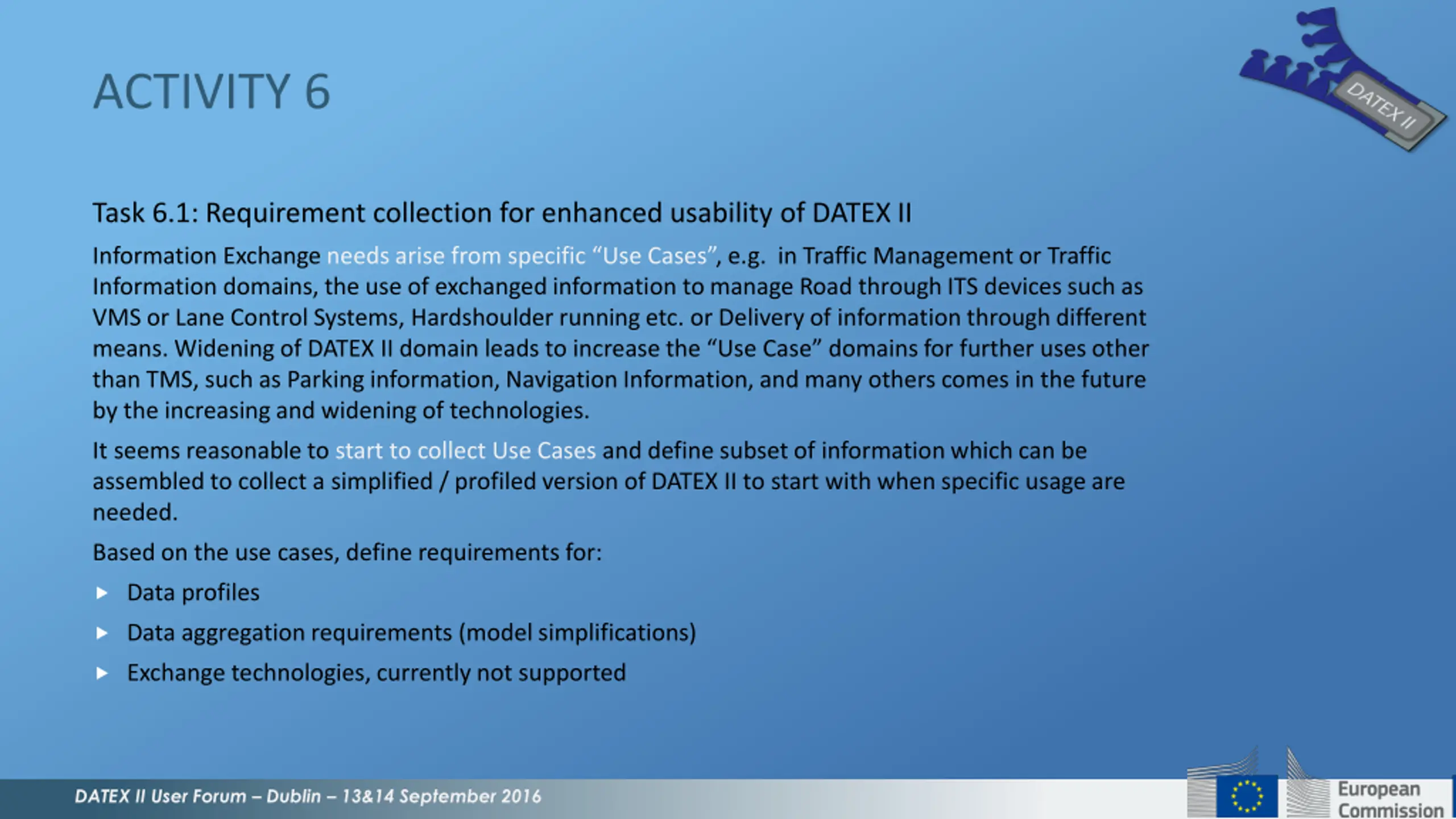 ACTIVITY 6 Task 6.1: Requirement collection for enhanced usability of DATEX II Information Exchange needs arise from specific Use Cases , e.g. in Traffic Management or Traffic Information domains, the use of exchanged information to manage Road through ITS devices such as VMS or Lane Control Systems, Hardshoulder running etc. or Delivery of information through different means. Widening of DATEX II domain leads to increase the Use Case domains for further uses other than TMS, such as Parking information, Navigation Information, and many others comes in the future by the increasing and widening of technologies. It seems reasonable to start to collect Use Cases and define subset of information which can be assembled to collect a simplified / profiled version of DATEX II to start with when specific usage are needed. Based on the use cases, define requirements for: Data profiles Data aggregation requirements (model simplifications) Exchange technologies, currently not supported DATEX II User Forum Dublin 13&14 September 2016