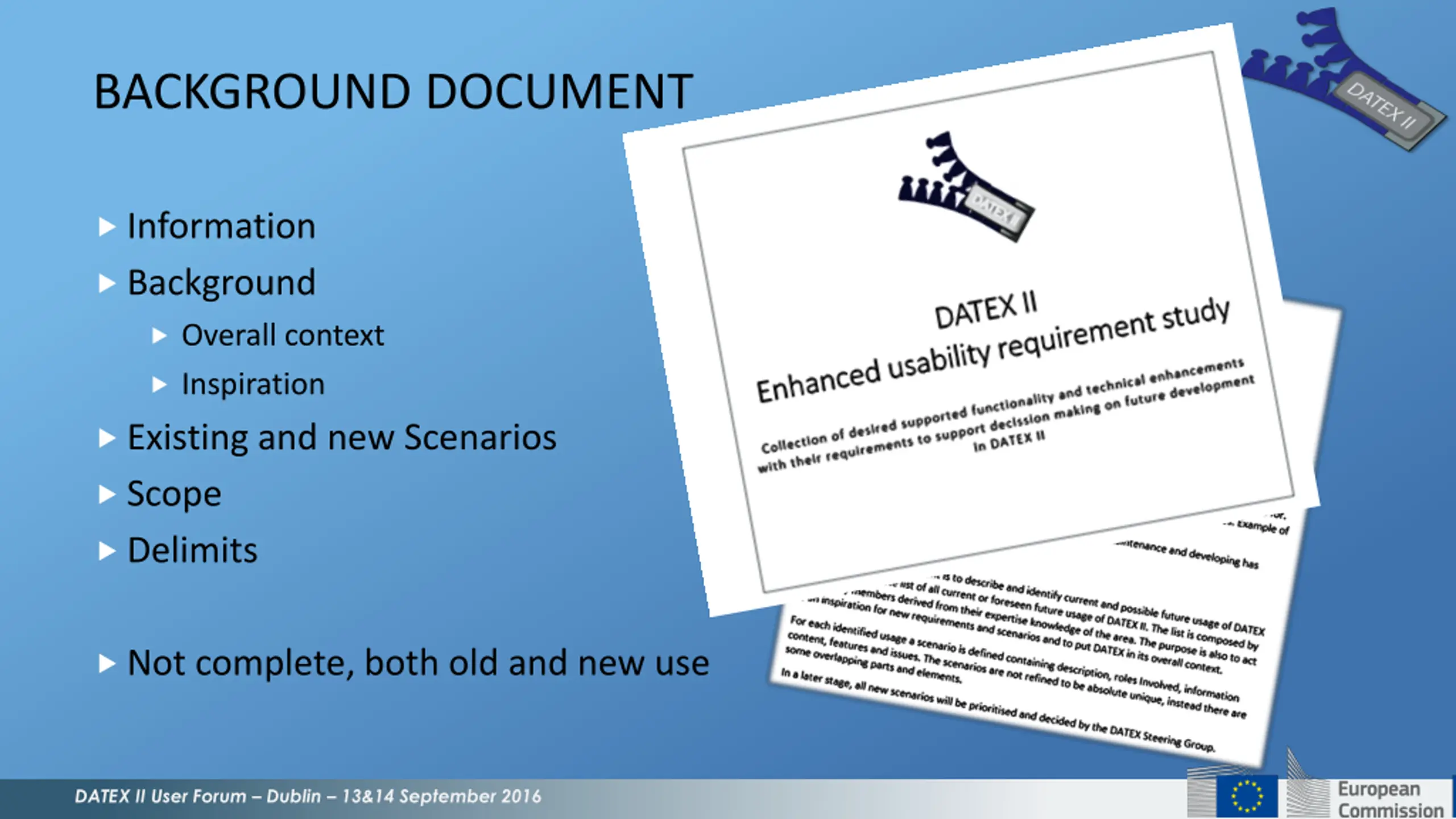 BACKGROUND DOCUMENT Information Background Overall context Inspiration Existing and new Scenarios Scope Delimits Not complete, both old and new use DATEX II User Forum Dublin 13&14 September 2016