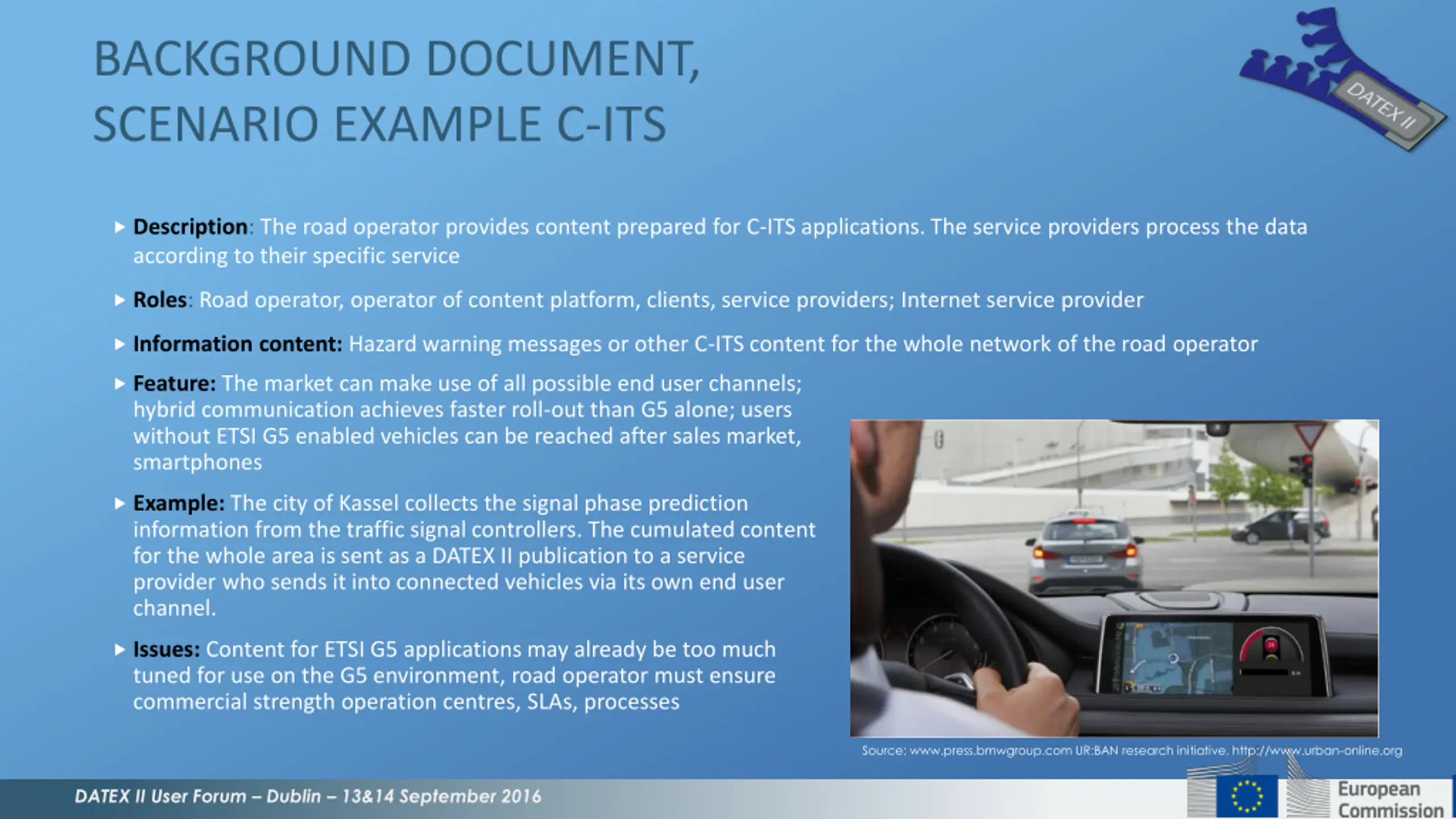 BACKGROUND DOCUMENT, SCENARIO EXAMPLE C-ITS Description: The road operator provides content prepared for C-ITS applications. The service providers process the data according to their specific service Roles: Road operator, operator of content platform, clients, service providers; Internet service provider Information content: Hazard warning messages or other C-ITS content for the whole network of the road operator Feature: The market can make use of all possible end user channels; hybrid communication achieves faster roll-out than G5 alone; users without ETSI G5 enabled vehicles can be reached after sales market, smartphones Example: The city of Kassel collects the signal phase prediction information from the traffic signal controllers. The cumulated content for the whole area is sent as a DATEX II publication to a service provider who sends it into connected vehicles via its own end user channel. Issues: Content for ETSI G5 applications may already be too much tuned for use on the G5 environment, road operator must ensure commercial strength operation centres, SLAs, processes Source: www.press.bmwgroup.com UR:BAN research initiative, http://www.urban-online.org DATEX II User Forum Dublin 13&14 September 2016