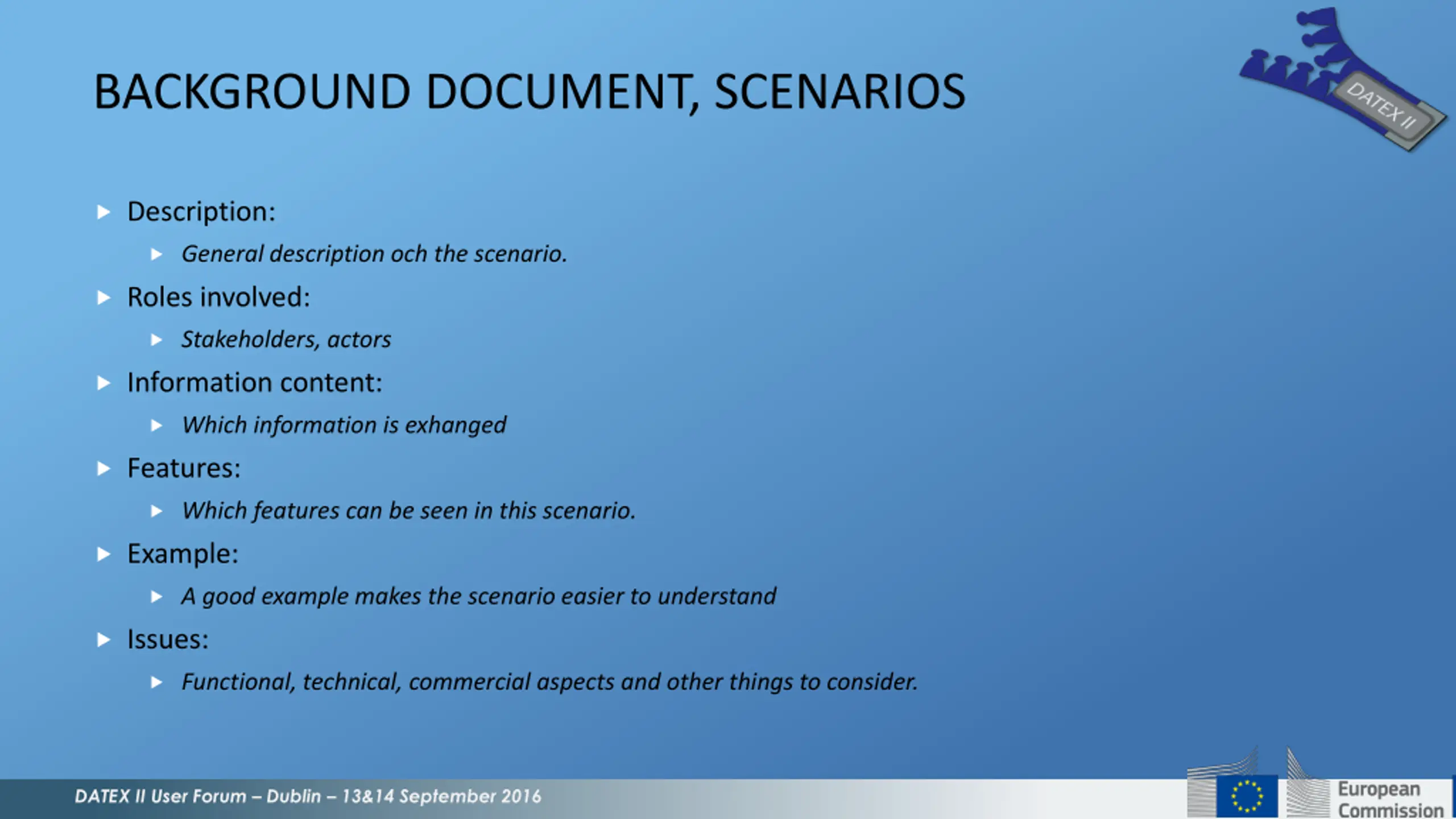 BACKGROUND DOCUMENT, SCENARIOS Description: General description och the scenario. Roles involved: Stakeholders, actors Information content: Which information is exhanged Features: Which features can be seen in this scenario. Example: A good example makes the scenario easier to understand Issues: Functional, technical, commercial aspects and other things to consider. DATEX II User Forum Dublin 13&14 September 2016