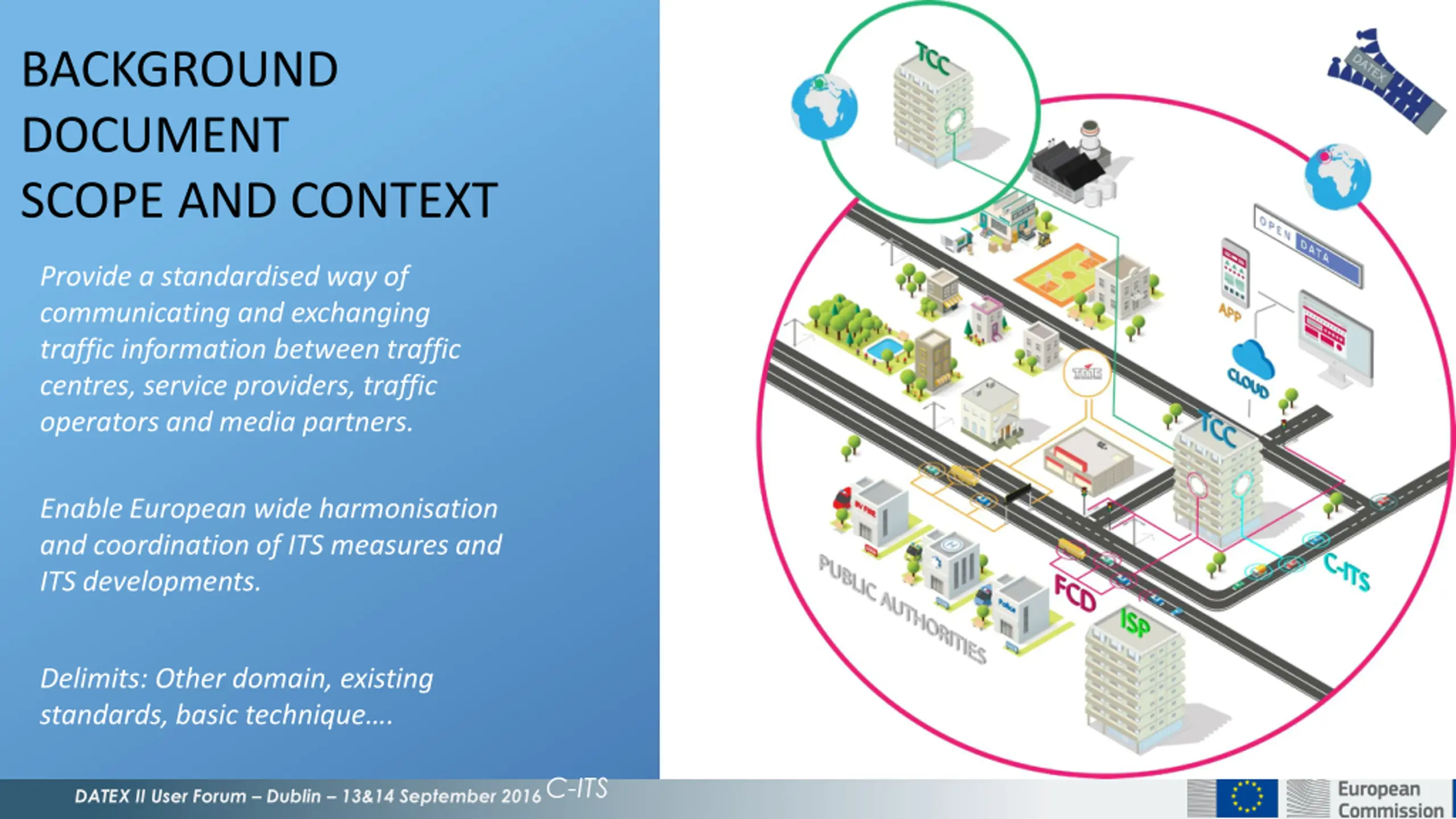 BACKGROUND DOCUMENT SCOPE AND CONTEXT Provide a standardised way of communicating and exchanging traffic information between traffic centres, service providers, traffic operators and media partners. Enable European wide harmonisation and coordination of ITS measures and ITS developments. Delimits: Other domain, existing standards, basic technique . C-ITS DATEX II User Forum Dublin 13&14 September 2016