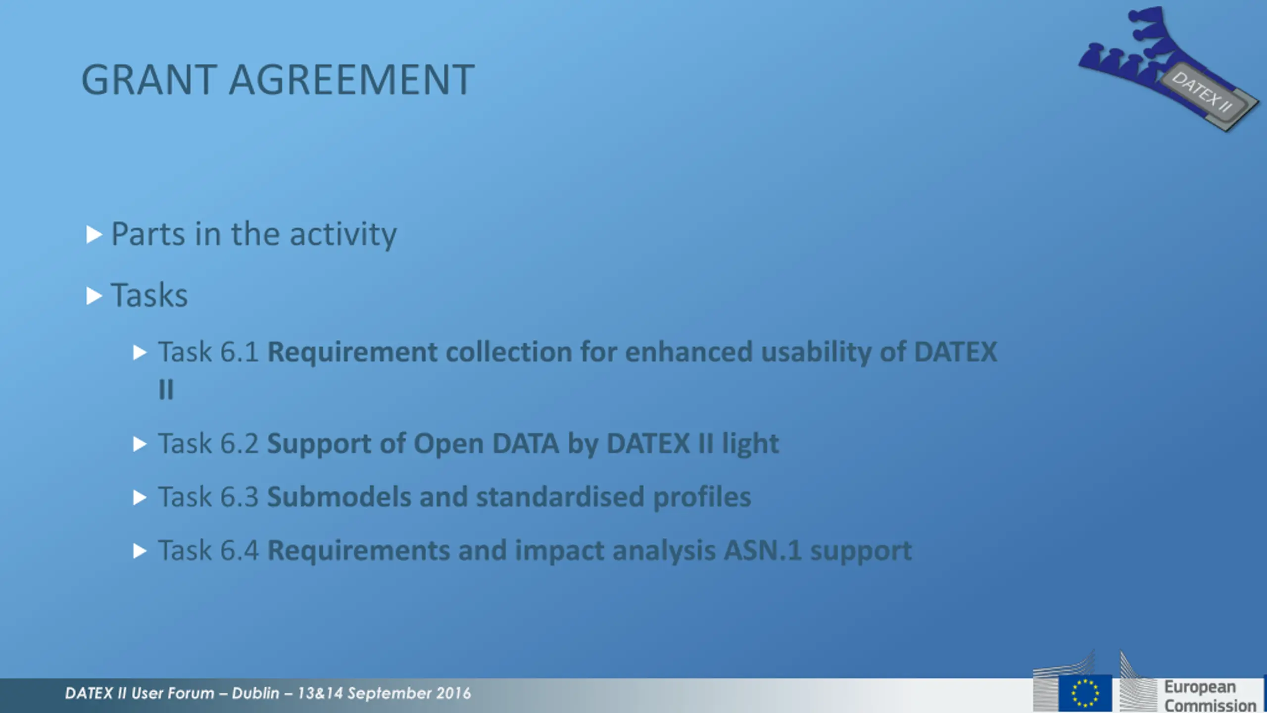 GRANT AGREEMENT Parts in the activity Tasks Task 6.1 Requirement collection for enhanced usability of DATEX II Task 6.2 Support of Open DATA by DATEX II light Task 6.3 Submodels and standardised profiles Task 6.4 Requirements and impact analysis ASN.1 support DATEX II User Forum Dublin 13&14 September 2016