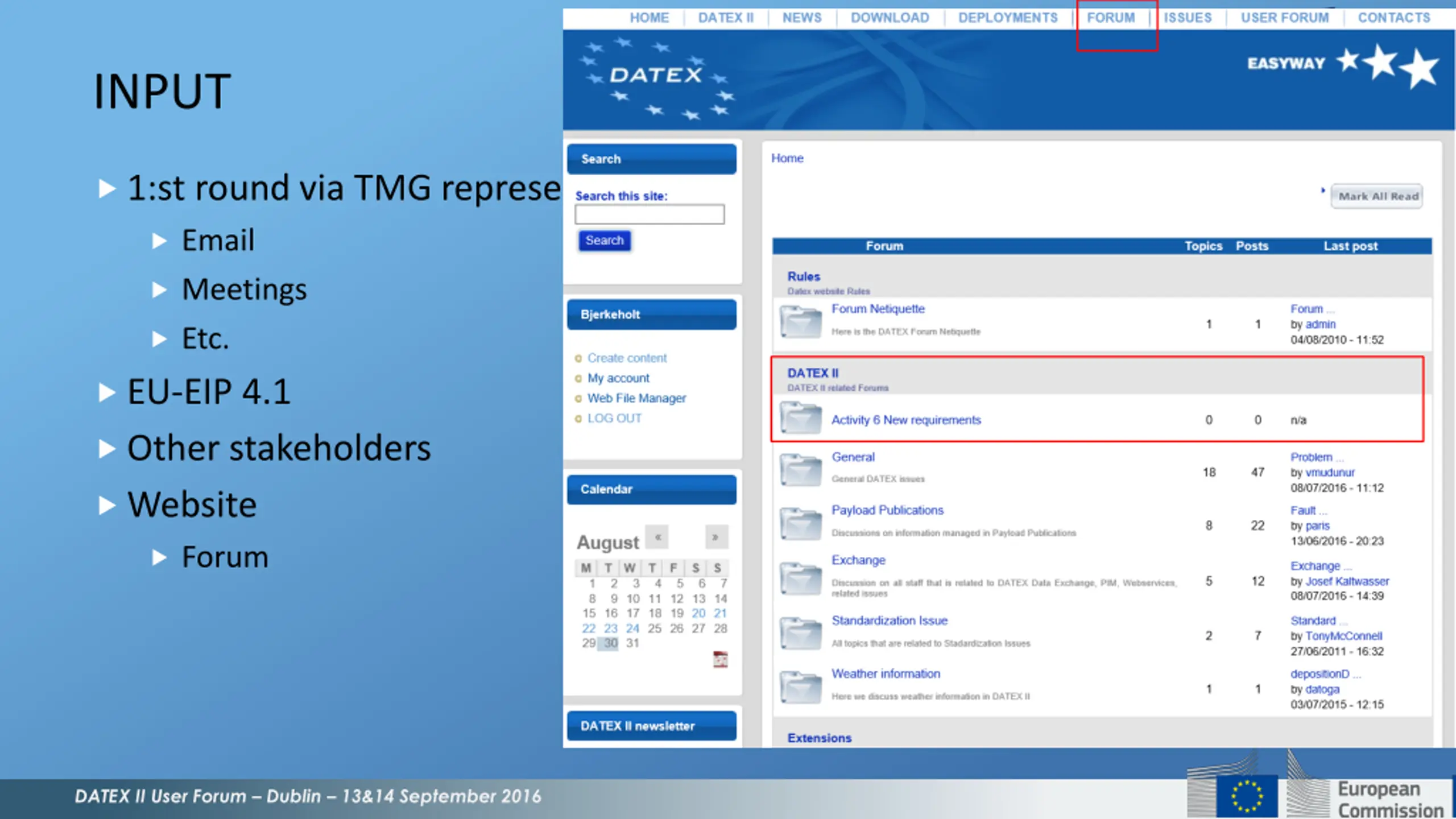 INPUT 1:st round via TMG representatives Email Meetings Etc. EU-EIP 4.1 Other stakeholders Website Forum DATEX II User Forum Dublin 13&14 September 2016