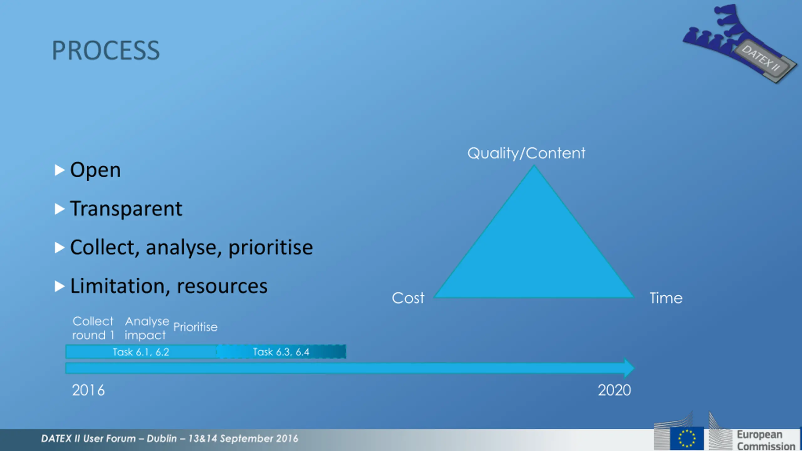 PROCESS Quality/Content Open Transparent Collect, analyse, prioritise Limitation, resources Cost Time Collect round 1 Analyse impact Prioritise Task 6.3, 6.4 Task 6.1, 6.2 2016 2020 DATEX II User Forum Dublin 13&14 September 2016