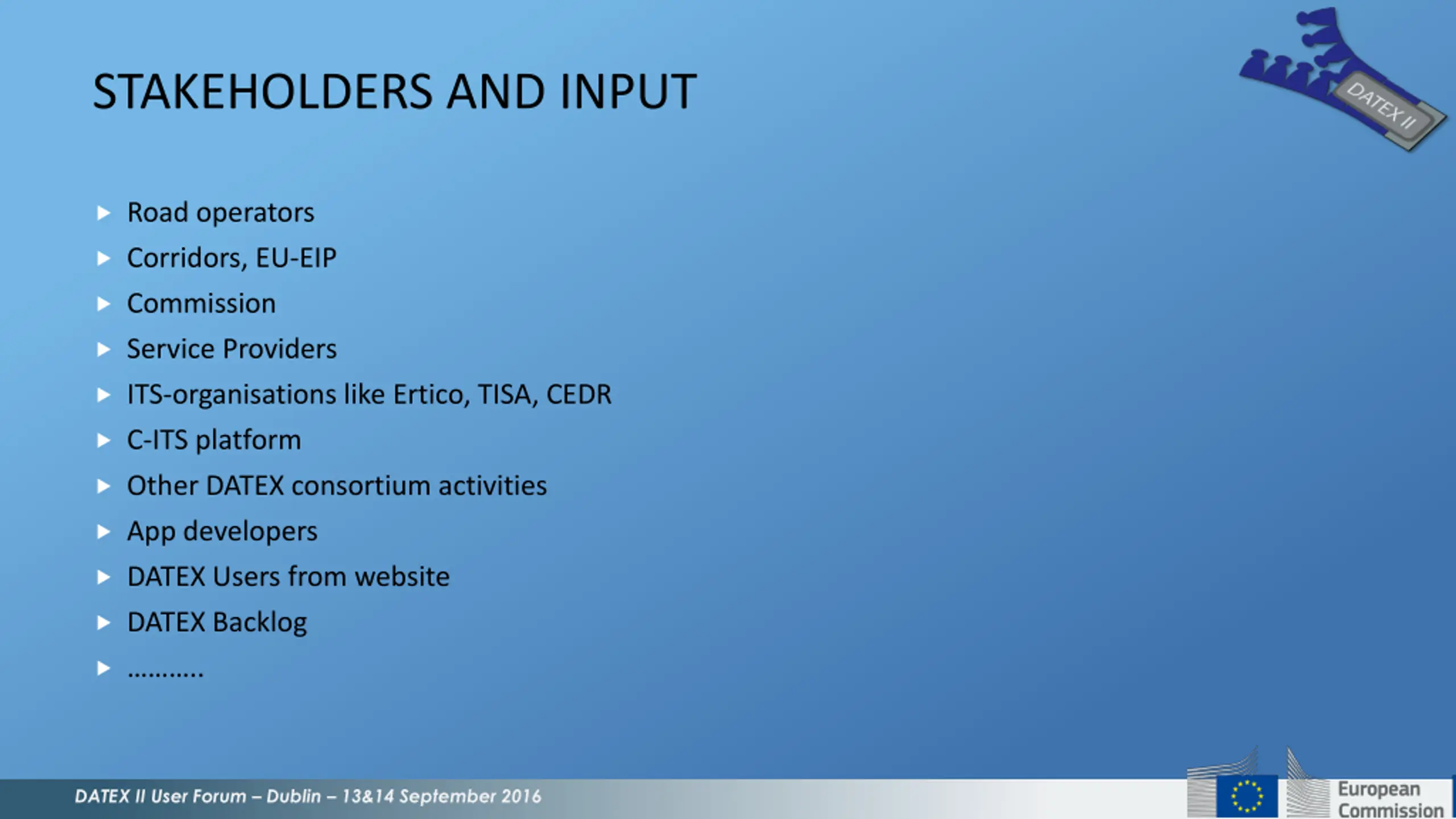 STAKEHOLDERS AND INPUT Road operators Corridors, EU-EIP Commission Service Providers ITS-organisations like Ertico, TISA, CEDR C-ITS platform Other DATEX consortium activities App developers DATEX Users from website DATEX Backlog .. DATEX II User Forum Dublin 13&14 September 2016