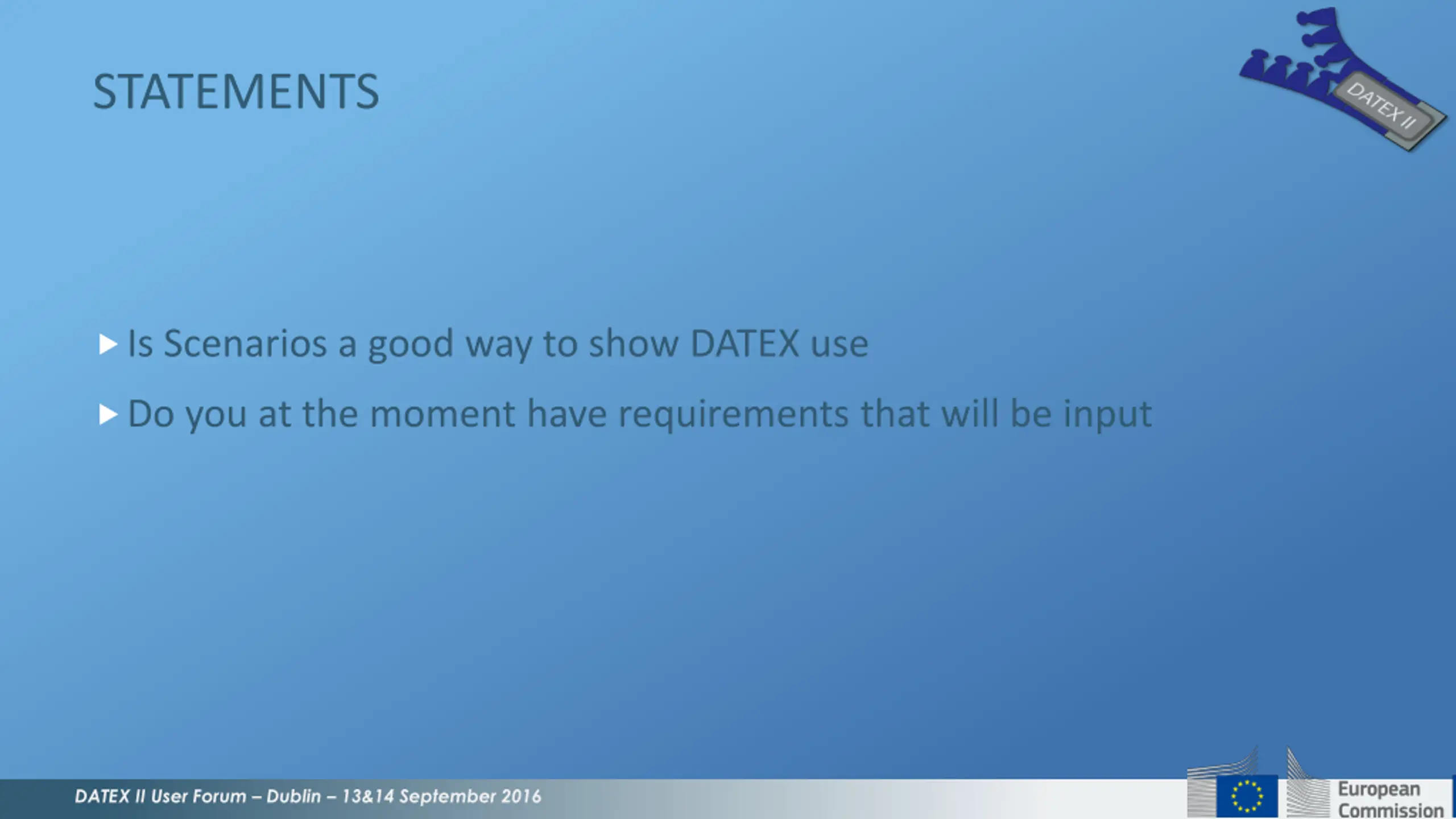 STATEMENTS Is Scenarios a good way to show DATEX use Do you at the moment have requirements that will be input DATEX II User Forum Dublin 13&14 September 2016
