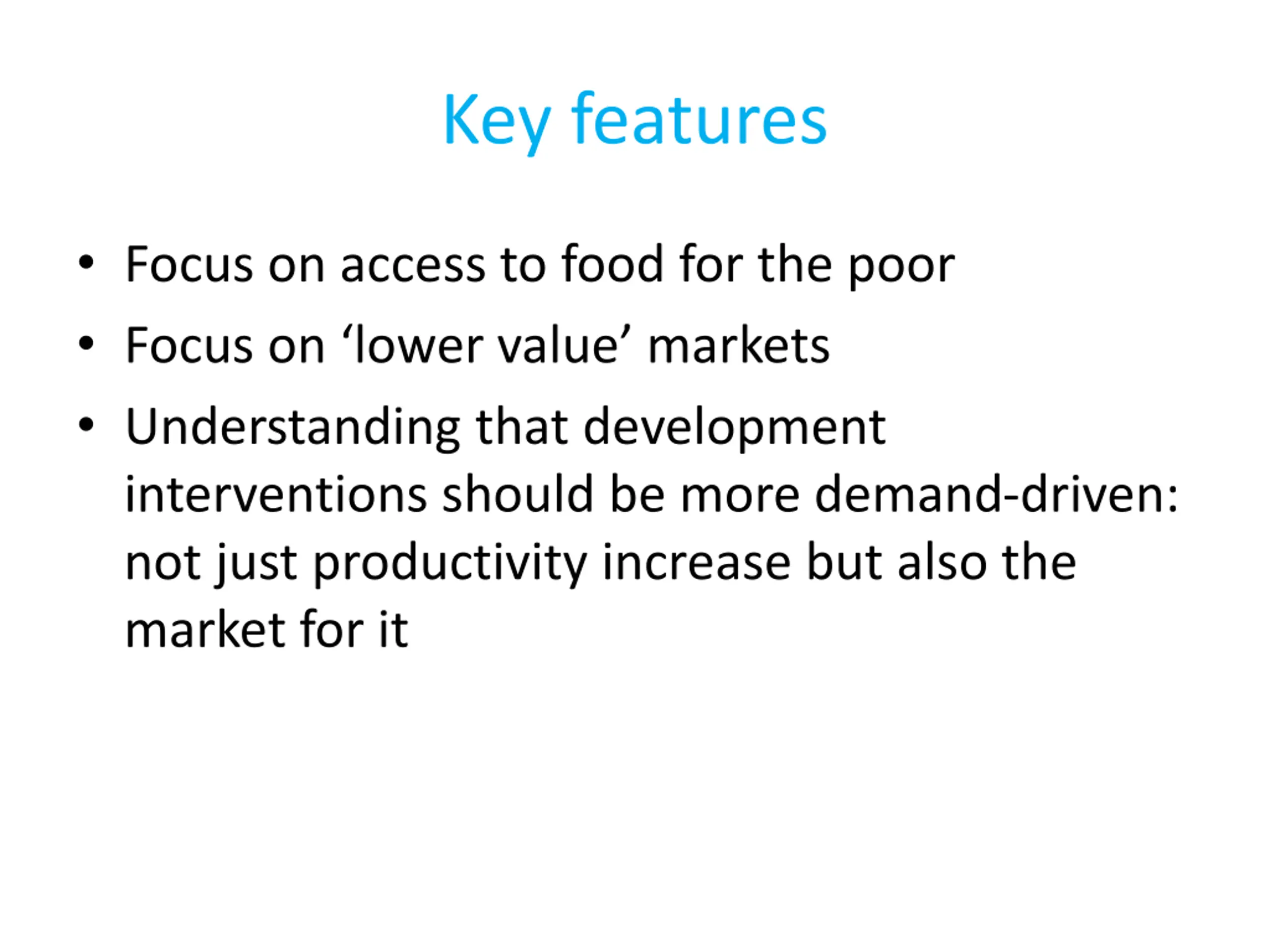 Key features Focus on access to food for the poor Focus on lower value markets Understanding that development interventions should be more demand-driven: not just productivity increase but also the market for it