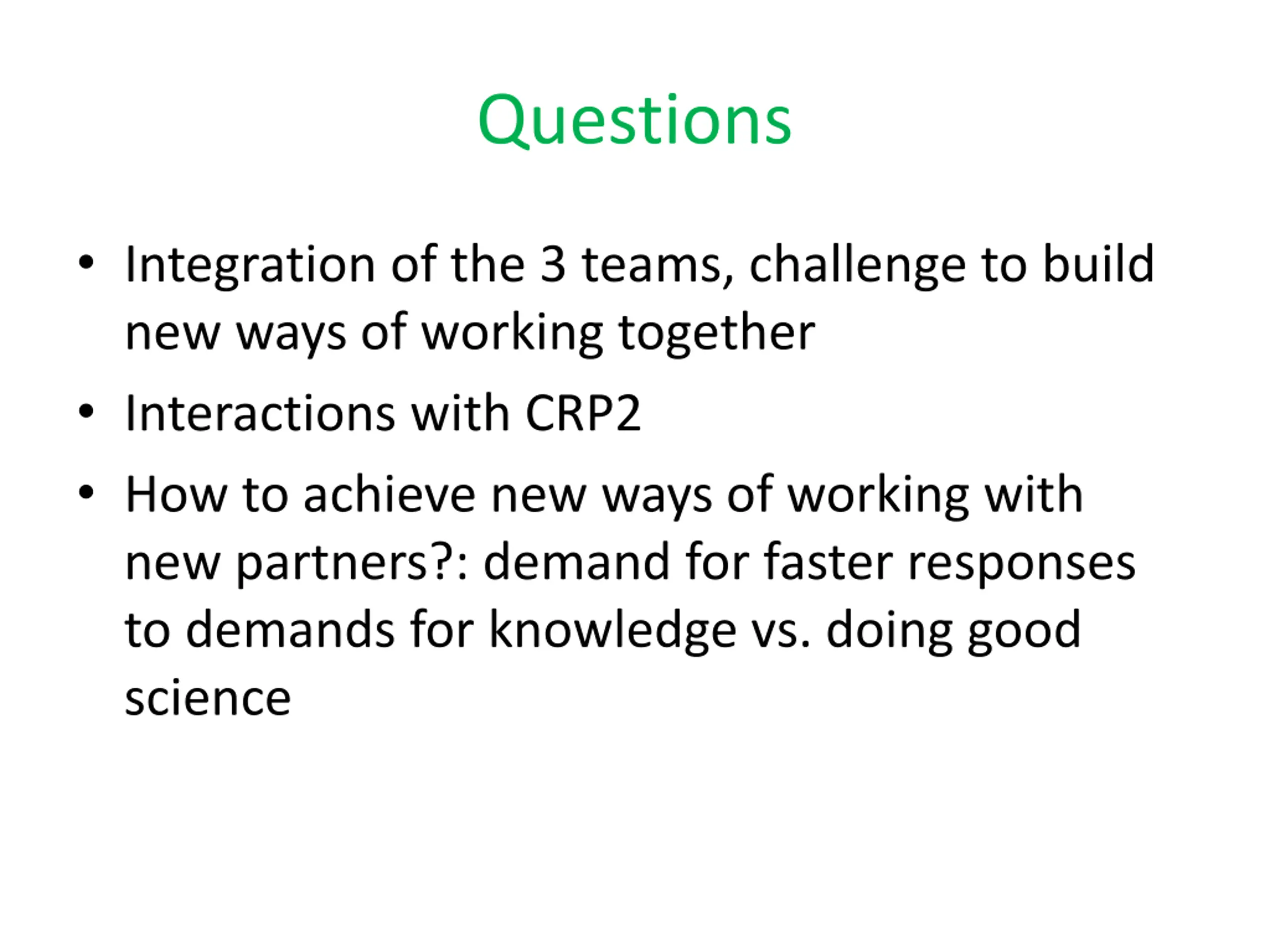 Questions Integration of the 3 teams, challenge to build new ways of working together Interactions with CRP2 How to achieve new ways of working with new partners?: demand for faster responses to demands for knowledge vs. doing good science