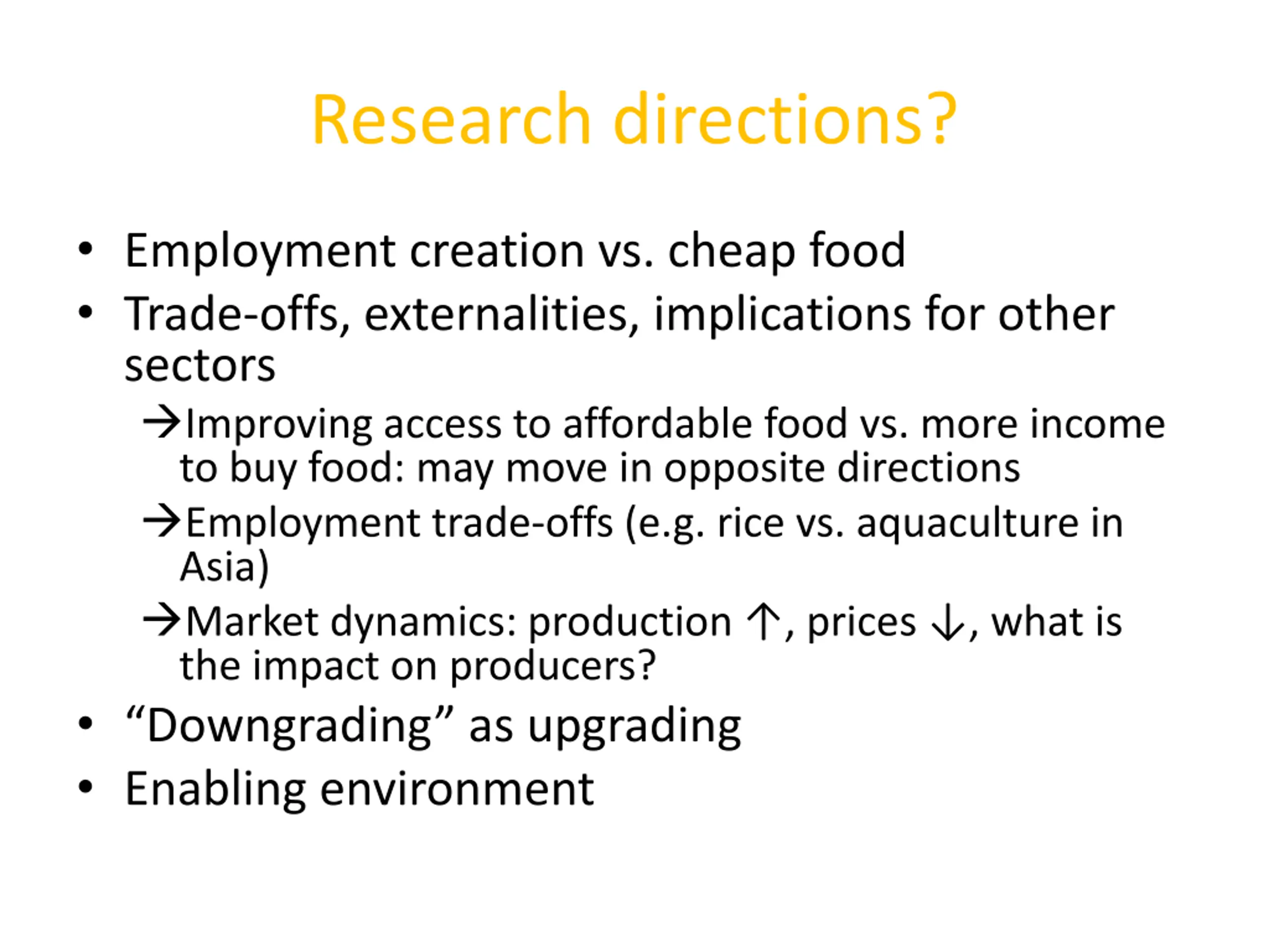 Research directions? Employment creation vs. cheap food Trade-offs, externalities, implications for other sectors Improving access to affordable food vs. more income to buy food: may move in opposite directions Employment trade-offs (e.g. rice vs. aquaculture in Asia) Market dynamics: production , prices , what is the impact on producers? Downgrading as upgrading Enabling environment