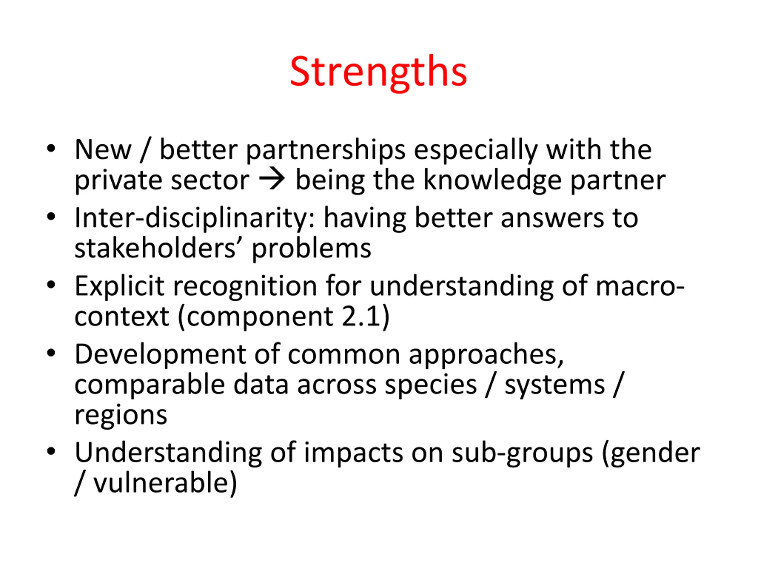 Strengths New / better partnerships especially with the private sector being the knowledge partner Inter-disciplinarity: having better answers to stakeholders problems Explicit recognition for understanding of macro- context (component 2.1) Development of common approaches, comparable data across species / systems / regions Understanding of impacts on sub-groups (gender / vulnerable)