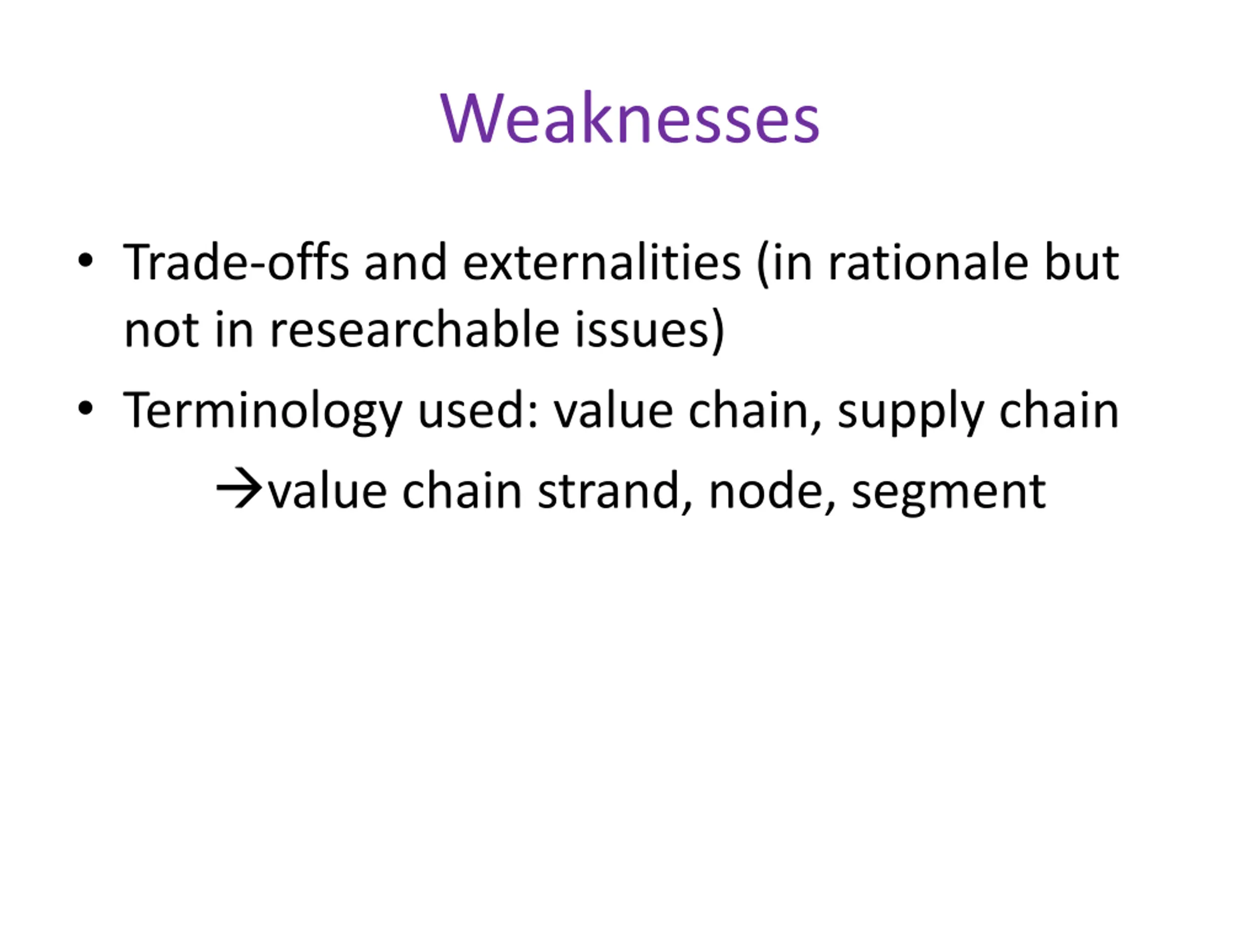 Weaknesses Trade-offs and externalities (in rationale but not in researchable issues) Terminology used: value chain, supply chain value chain strand, node, segment