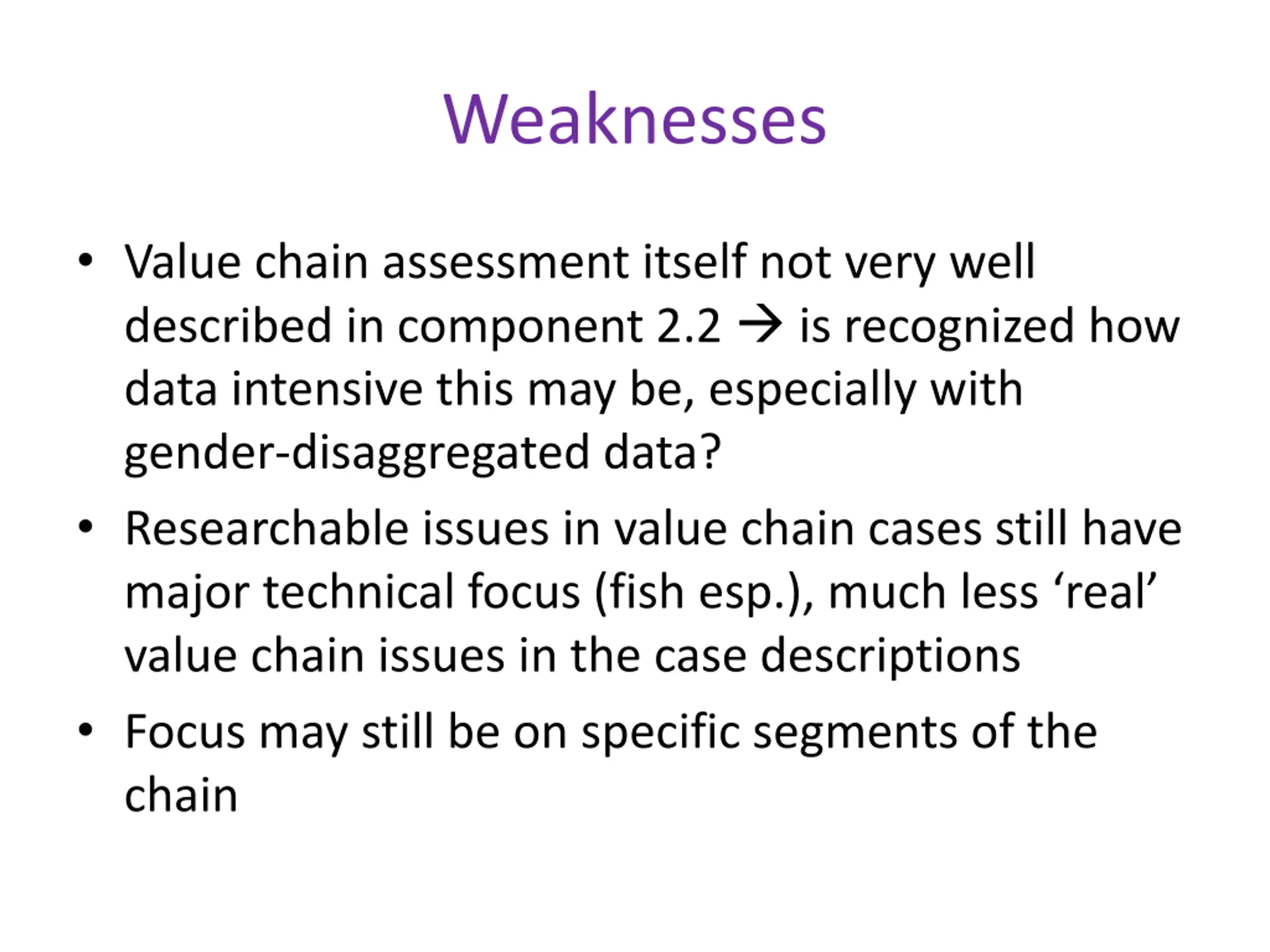 Weaknesses Value chain assessment itself not very well described in component 2.2 is recognized how data intensive this may be, especially with gender-disaggregated data? Researchable issues in value chain cases still have major technical focus (fish esp.), much less real value chain issues in the case descriptions Focus may still be on specific segments of the chain