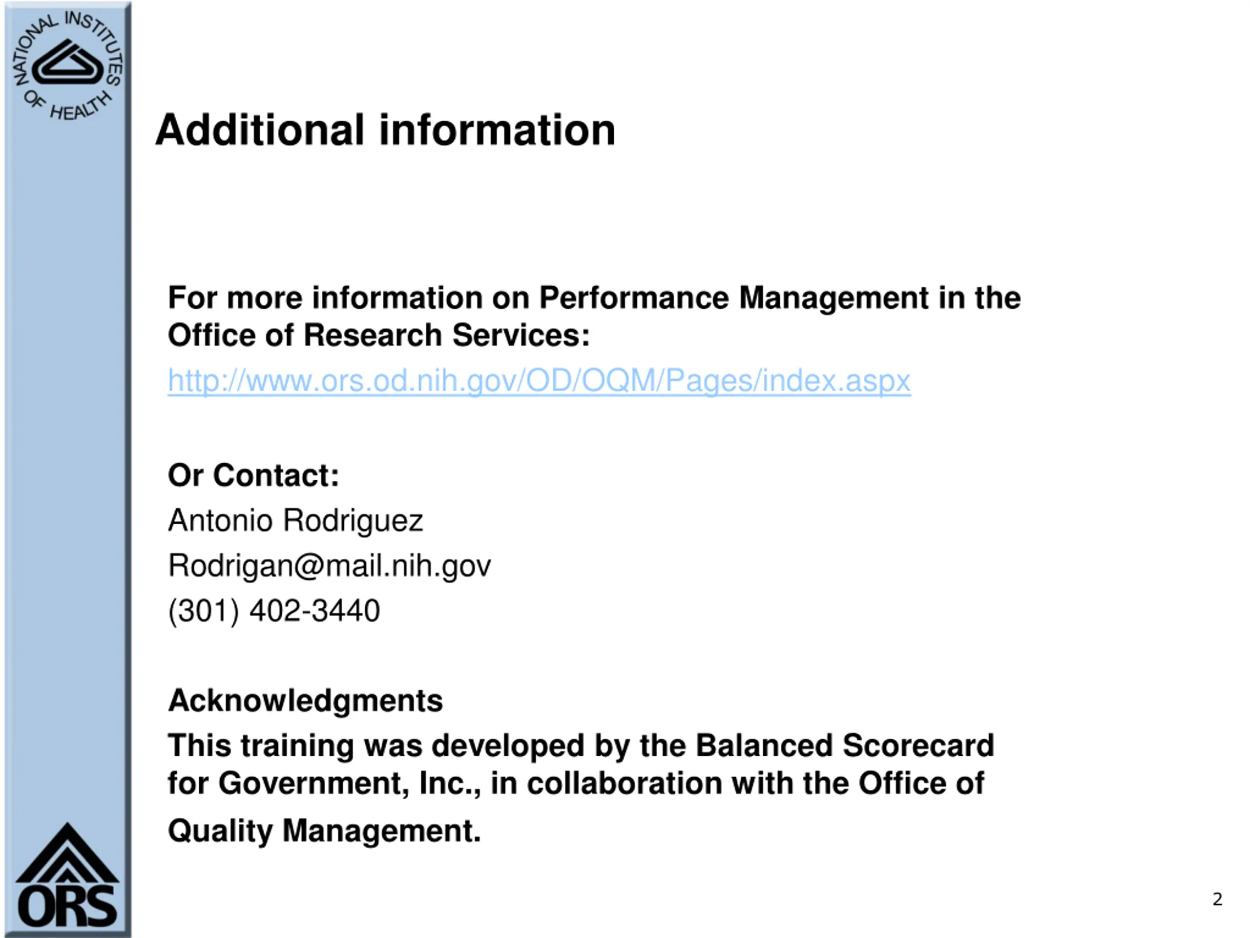 Additional information For more information on Performance Management in the Office of Research Services: http://www.ors.od.nih.gov/OD/OQM/Pages/index.aspx Or Contact: Antonio Rodriguez Rodrigan@mail.nih.gov (301) 402-3440 Acknowledgments This training was developed by the Balanced Scorecard for Government, Inc., in collaboration with the Office of Quality Management. 2