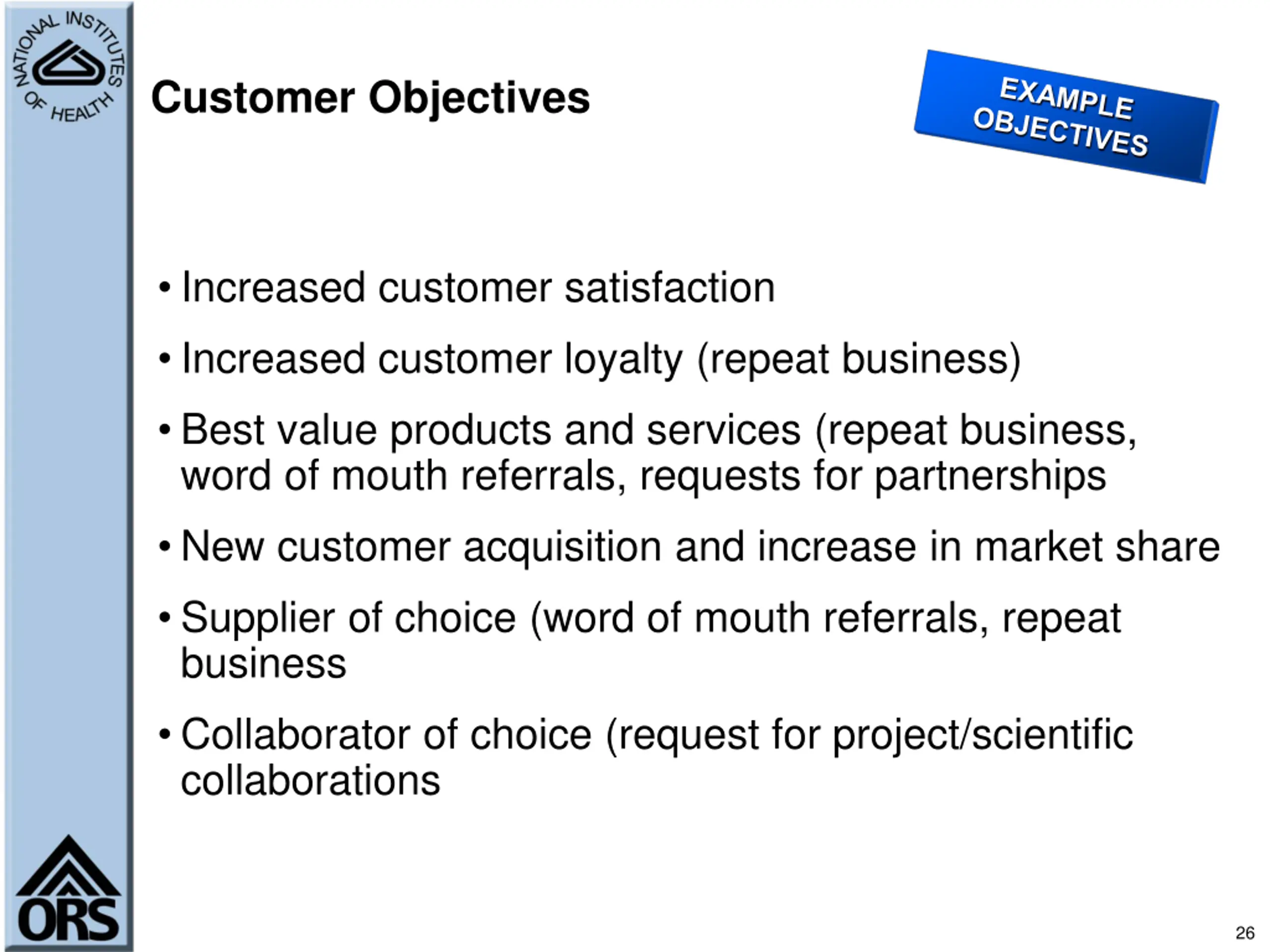 Customer Objectives Increased customer satisfaction Increased customer loyalty (repeat business) Best value products and services (repeat business, word of mouth referrals, requests for partnerships New customer acquisition and increase in market share Supplier of choice (word of mouth referrals, repeat business Collaborator of choice (request for project/scientific collaborations 26