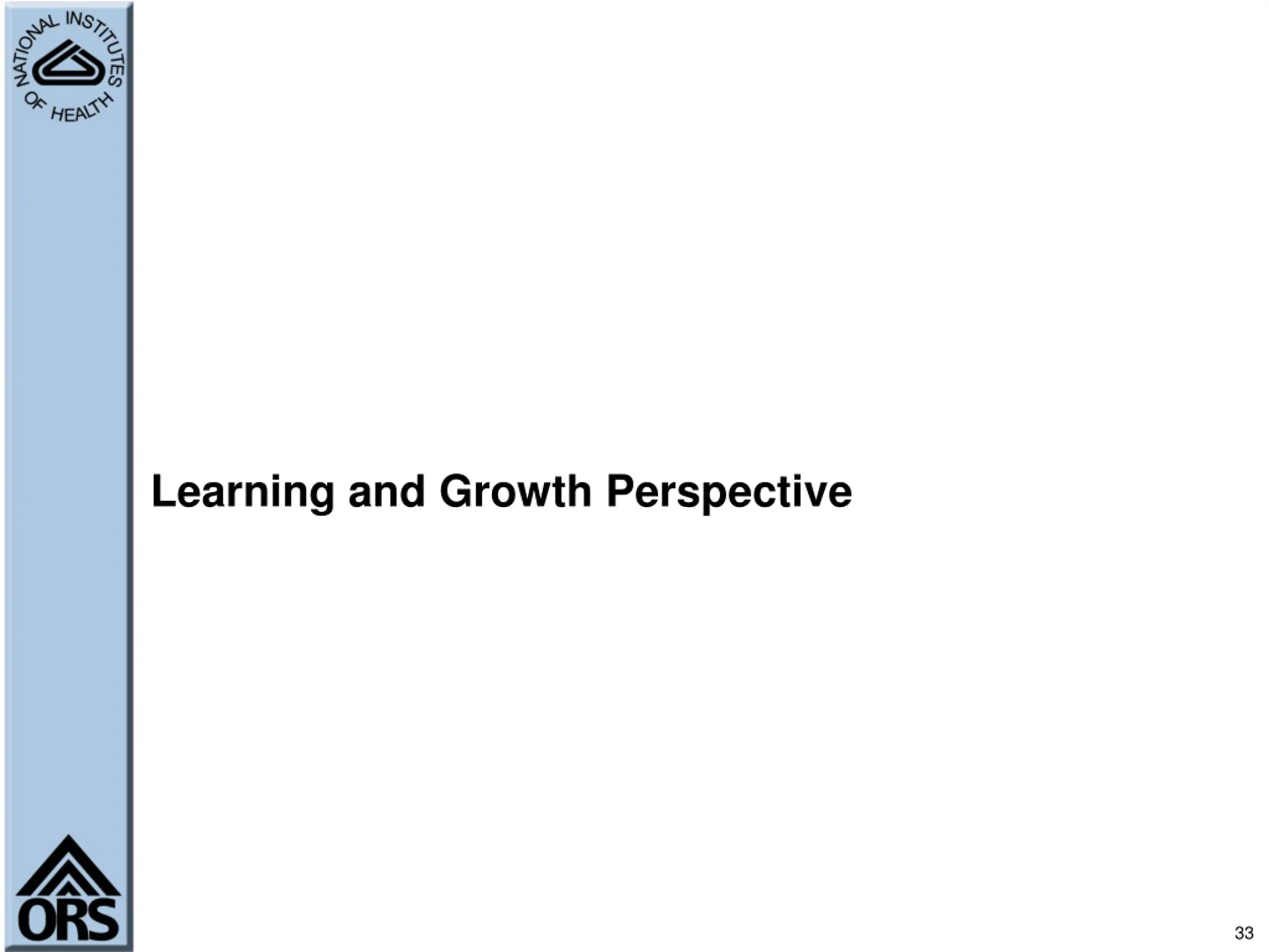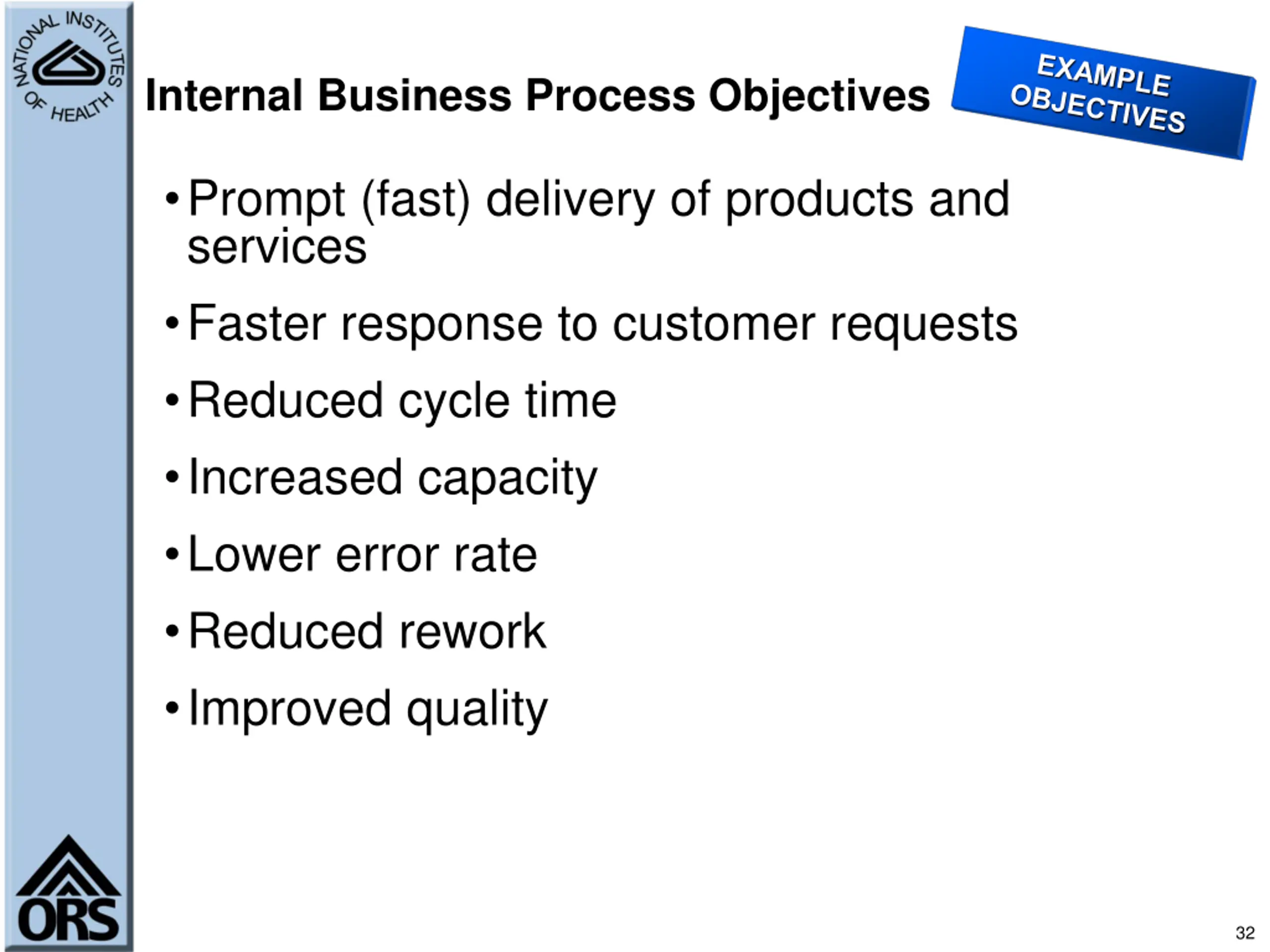 Internal Business Process Objectives Prompt (fast) delivery of products and services Faster response to customer requests Reduced cycle time Increased capacity Lower error rate Reduced rework Improved quality 32