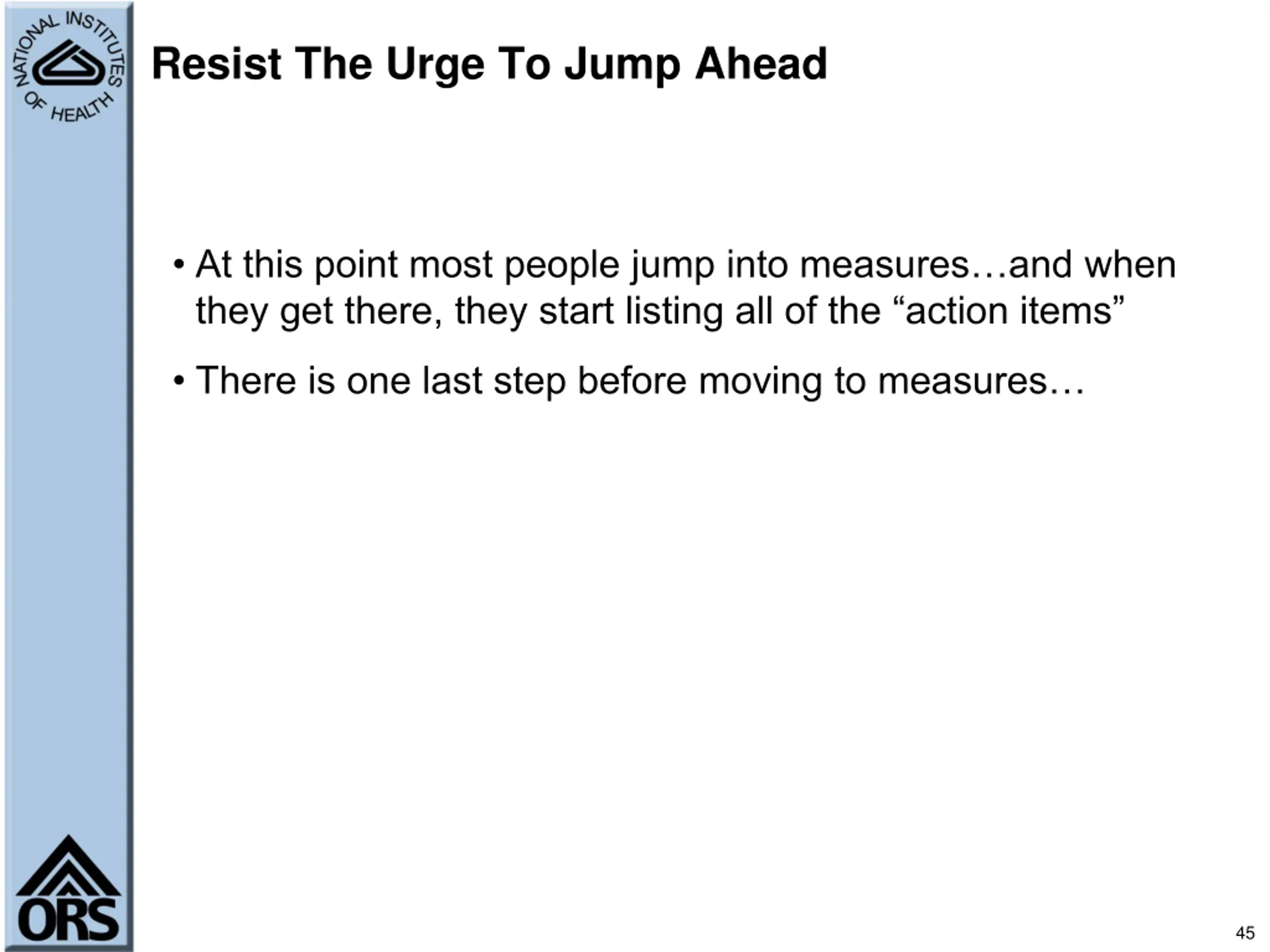 Resist The Urge To Jump Ahead At this point most people jump into measures and when they get there, they start listing all of the action items There is one last step before moving to measures 45