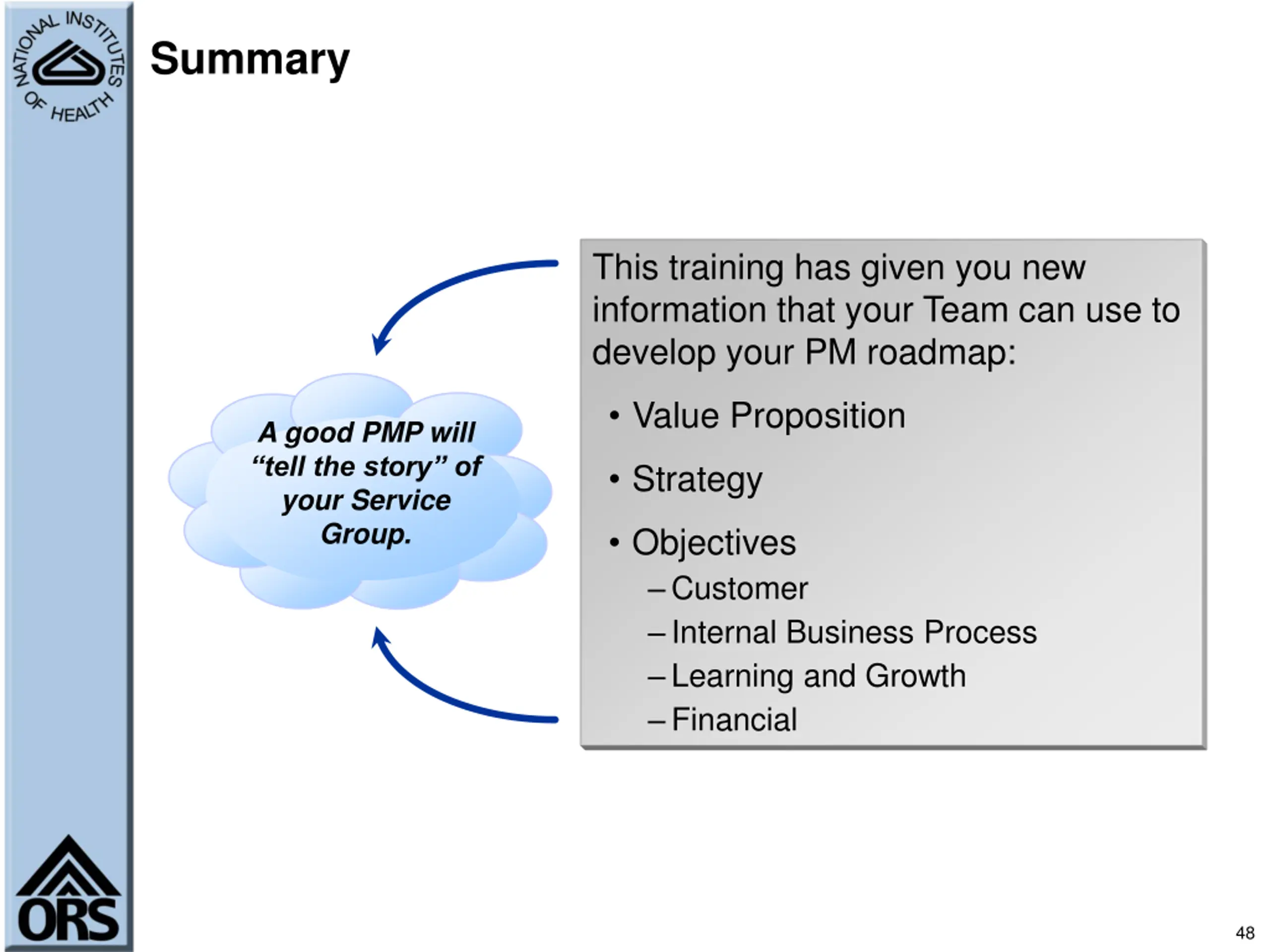 Summary This training has given you new information that your Team can use to develop your PM roadmap: Value Proposition A good PMP will tell the story of your Service Group. Strategy Objectives Customer Internal Business Process Learning and Growth Financial 48
