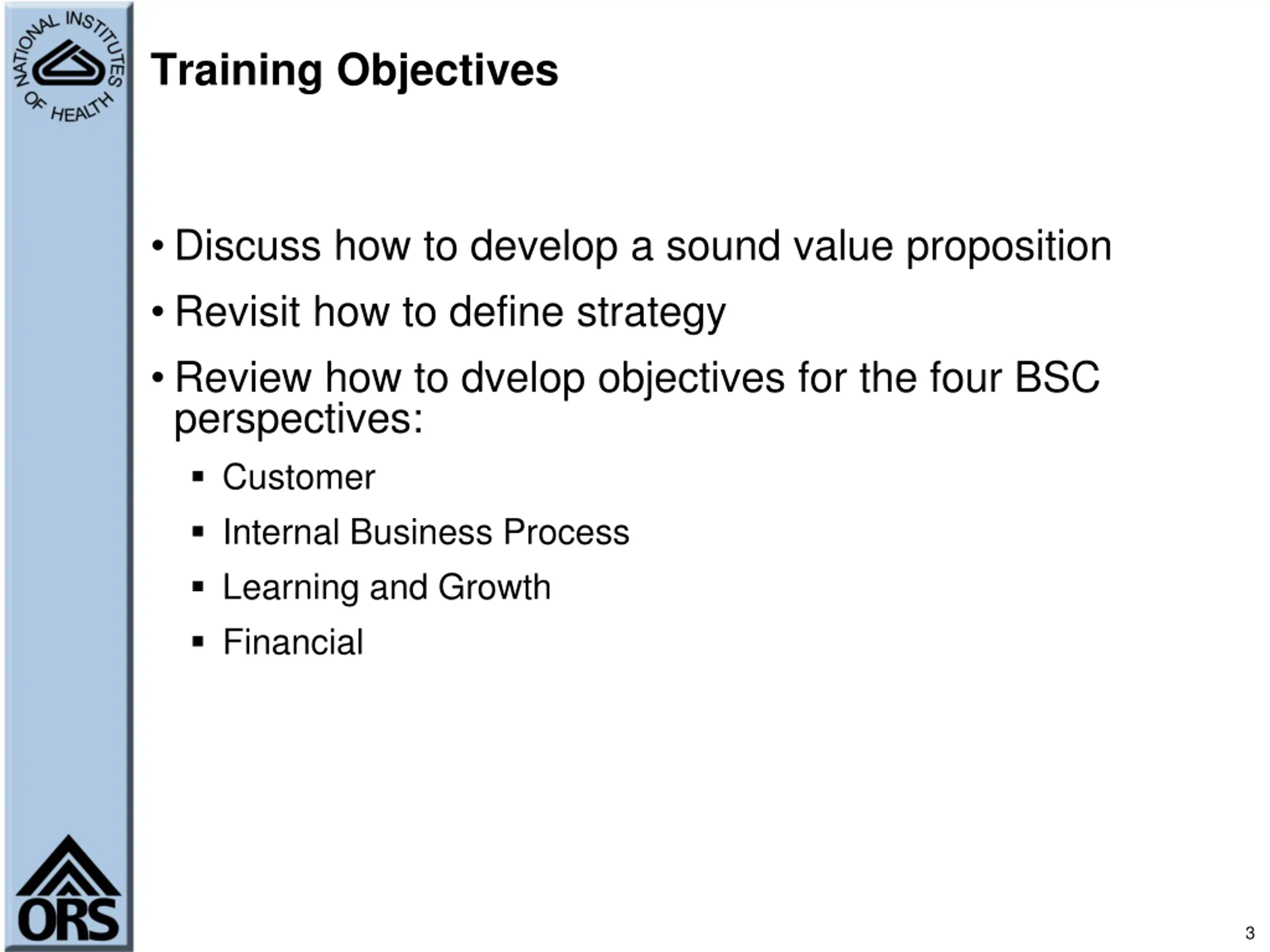Training Objectives Discuss how to develop a sound value proposition Revisit how to define strategy Review how to dvelop objectives for the four BSC perspectives: Customer Internal Business Process Learning and Growth Financial 3