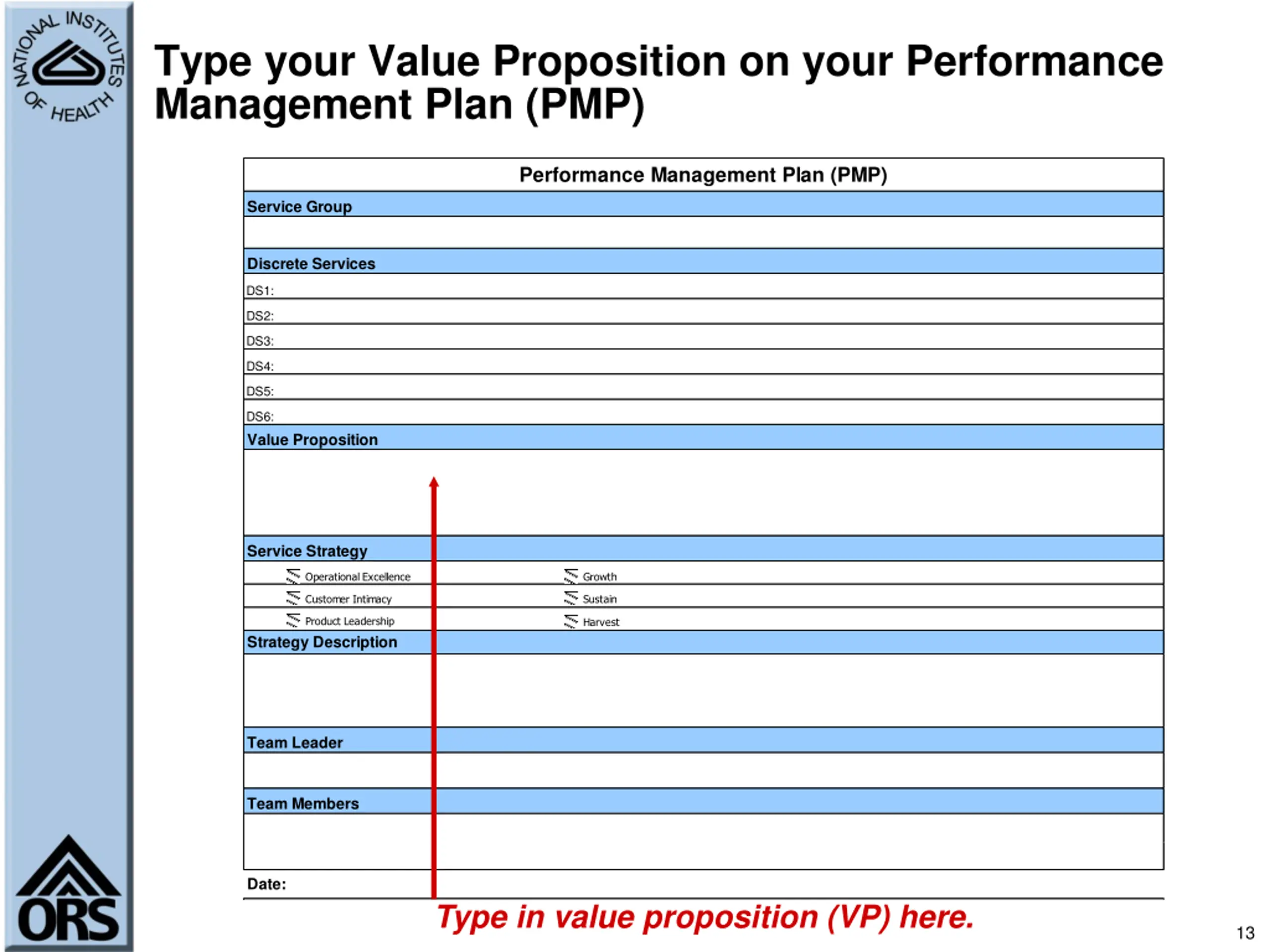 Type your Value Proposition on your Performance Management Plan (PMP) Performance Management Plan (PMP) Service Group Discrete Services DS1: DS2: DS3: DS4: DS5: DS6: Value Proposition Service Strategy Operational Excellence Growth Customer Intimacy Sustain Product Leadership Harvest Strategy Description Team Leader Team Members Date: Type in value proposition (VP) here. 13