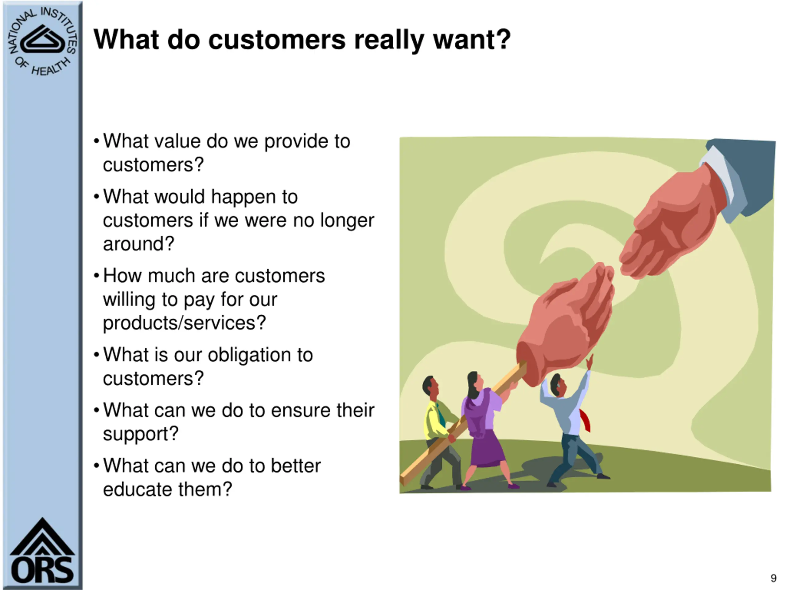 What do customers really want? What value do we provide to customers? What would happen to customers if we were no longer around? How much are customers willing to pay for our products/services? What is our obligation to customers? What can we do to ensure their support? What can we do to better educate them? 9