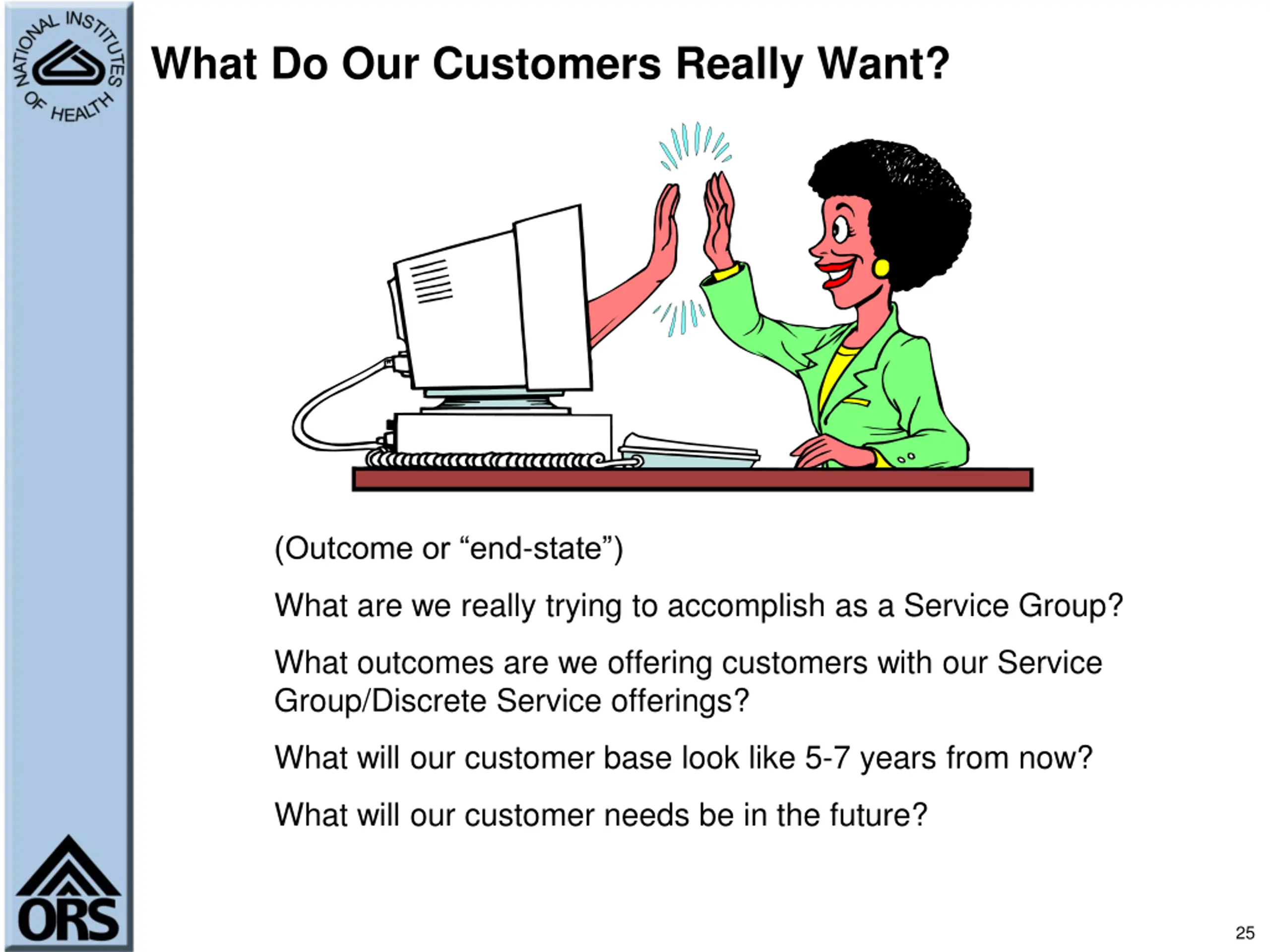 What Do Our Customers Really Want? (Outcome or end-state ) What are we really trying to accomplish as a Service Group? What outcomes are we offering customers with our Service Group/Discrete Service offerings? What will our customer base look like 5-7 years from now? What will our customer needs be in the future? 25