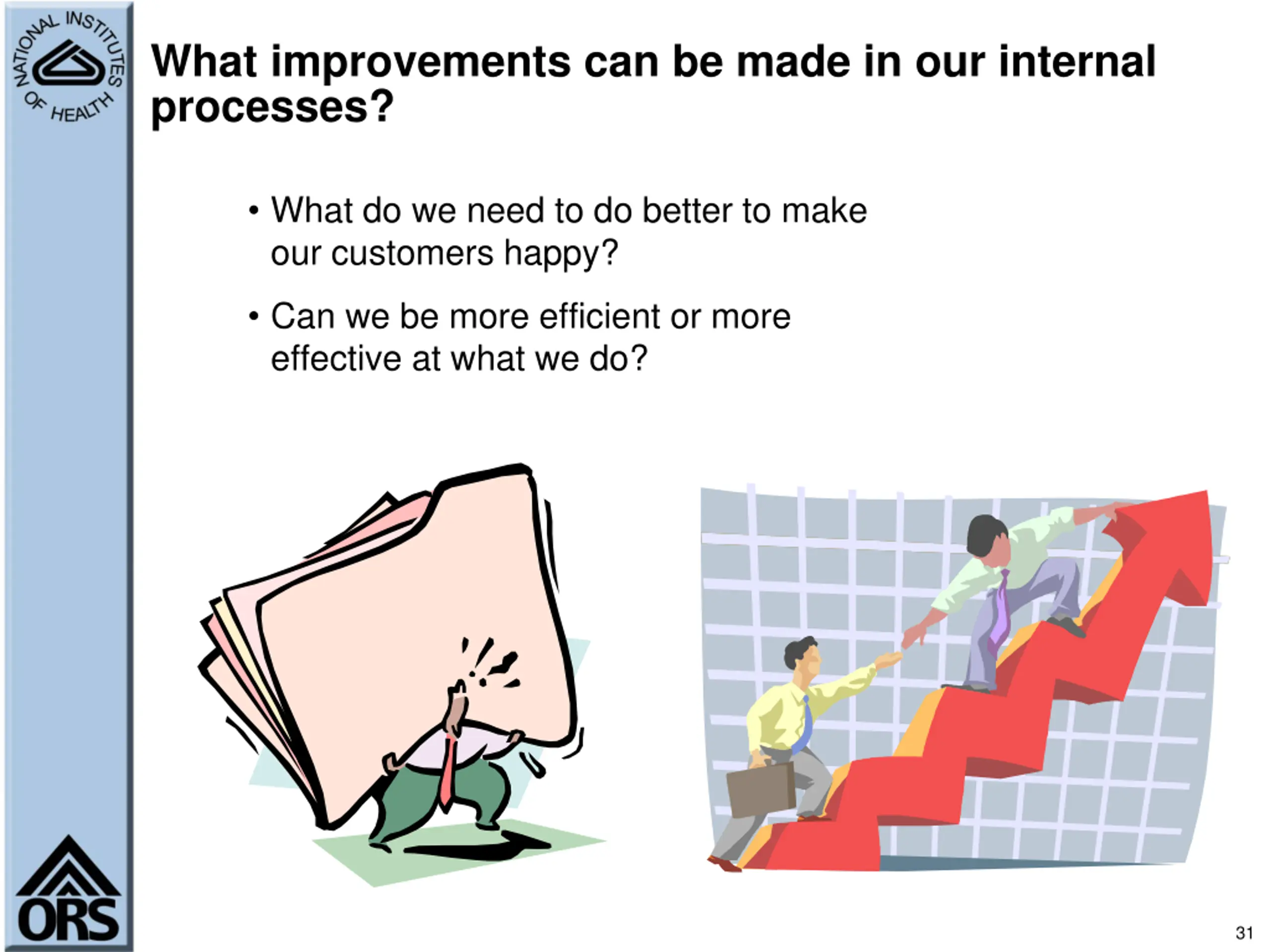 What improvements can be made in our internal processes? What do we need to do better to make our customers happy? Can we be more efficient or more effective at what we do? 31