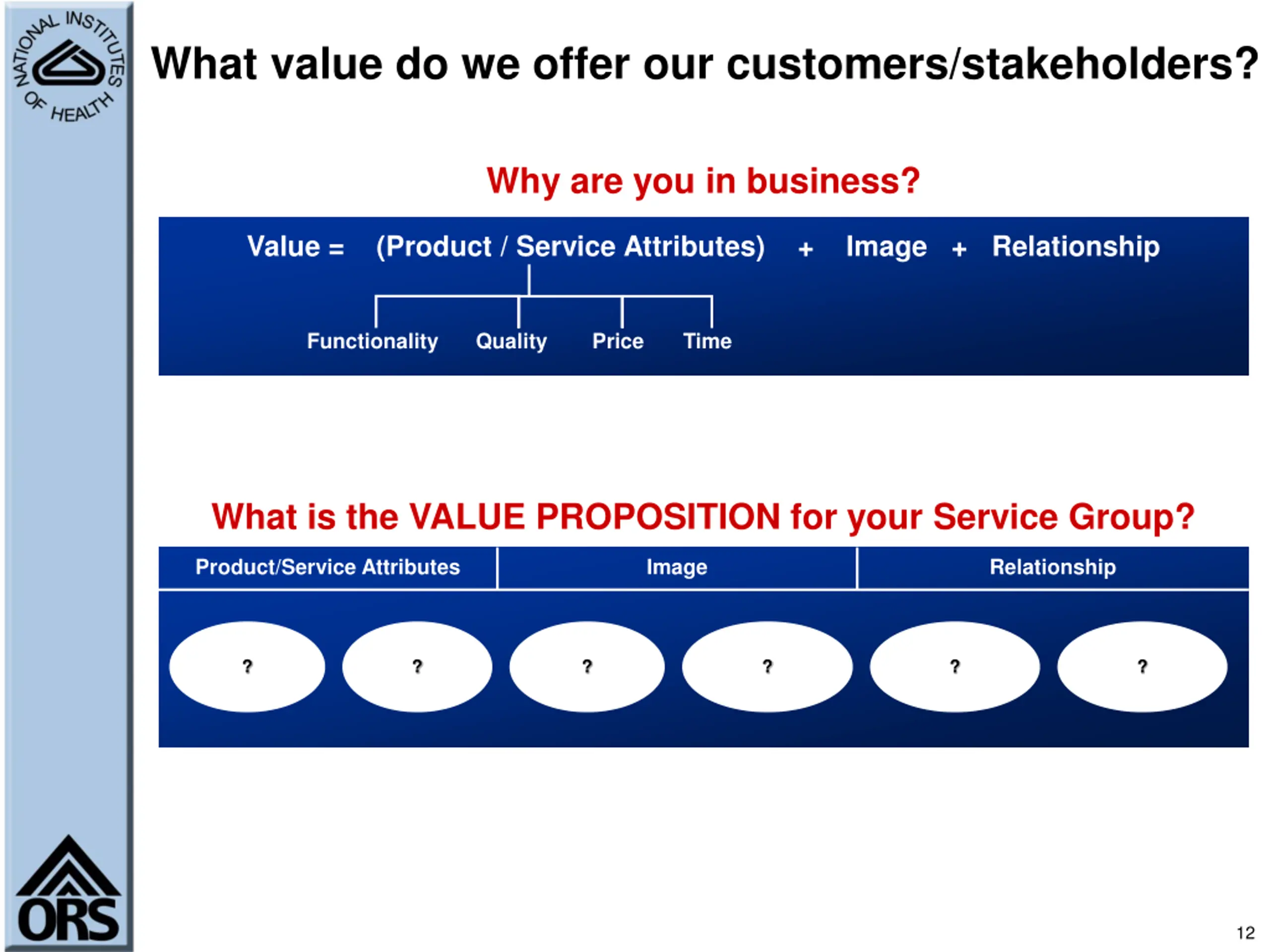 The Value Proposition Generic Model The value proposition should establish why Value = (Product / Service Attributes) + Image + Relationship Functionality Quality Price Time Example: Federal Agency Product/Service Attributes Image Relationship Personal Relationships (Customers) Service Oriented (Employees) Accessible (Services) Consistent (Products) Dedicated (People) Professional (Staff) VALUE PROPOSITION STATEMENT We bring value to NIH by providing our customers with convenient, accessible, and consistent services to ensure that visiting scientists acquire the required visas in the least amount of time at the best price to the agency. 11