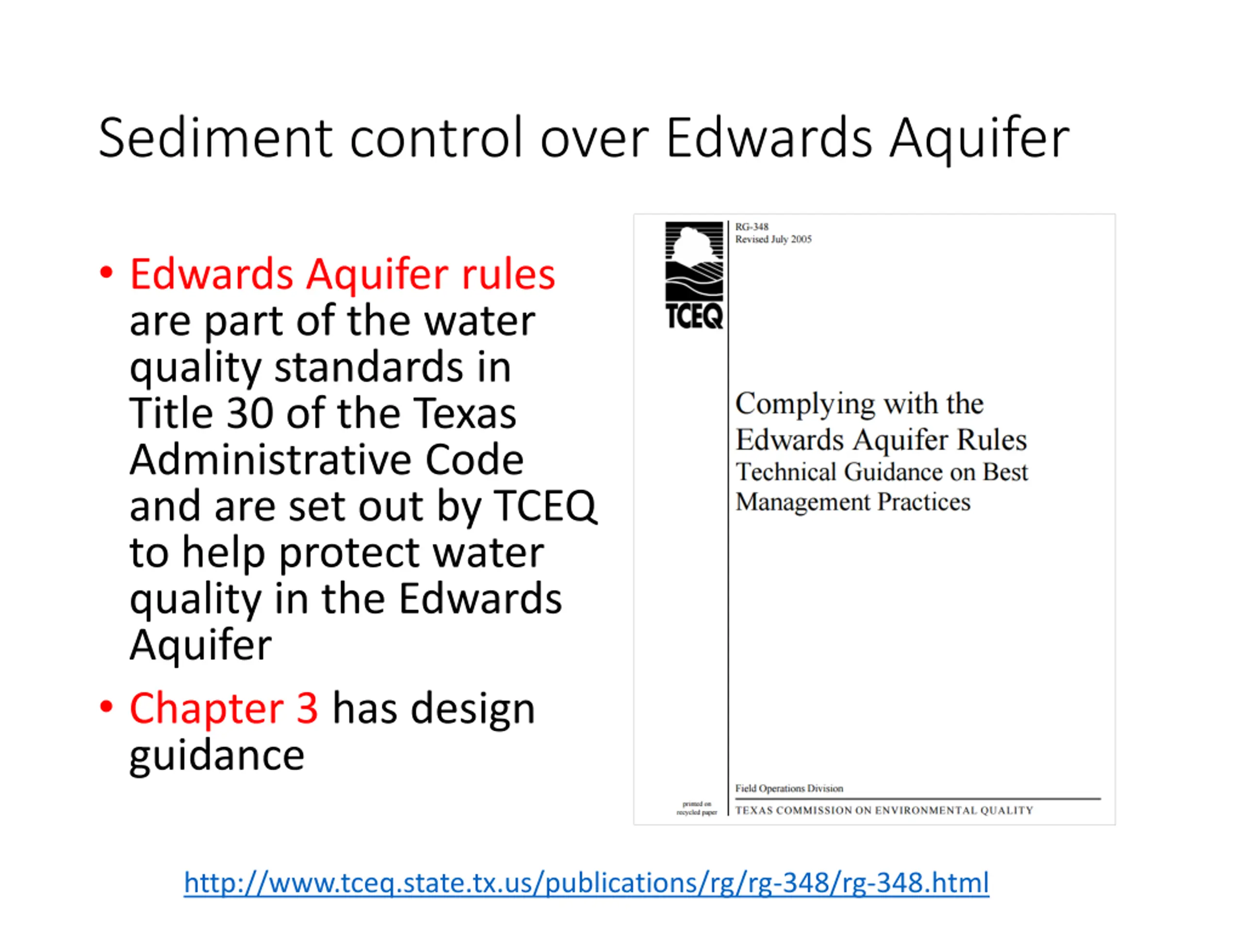 Sediment control over Edwards Aquifer Edwards Aquifer rules are part of the water quality standards in Title 30 of the Texas Administrative Code and are set out by TCEQ to help protect water quality in the Edwards Aquifer Chapter 3 has design guidance http://www.tceq.state.tx.us/publications/rg/rg-348/rg-348.html