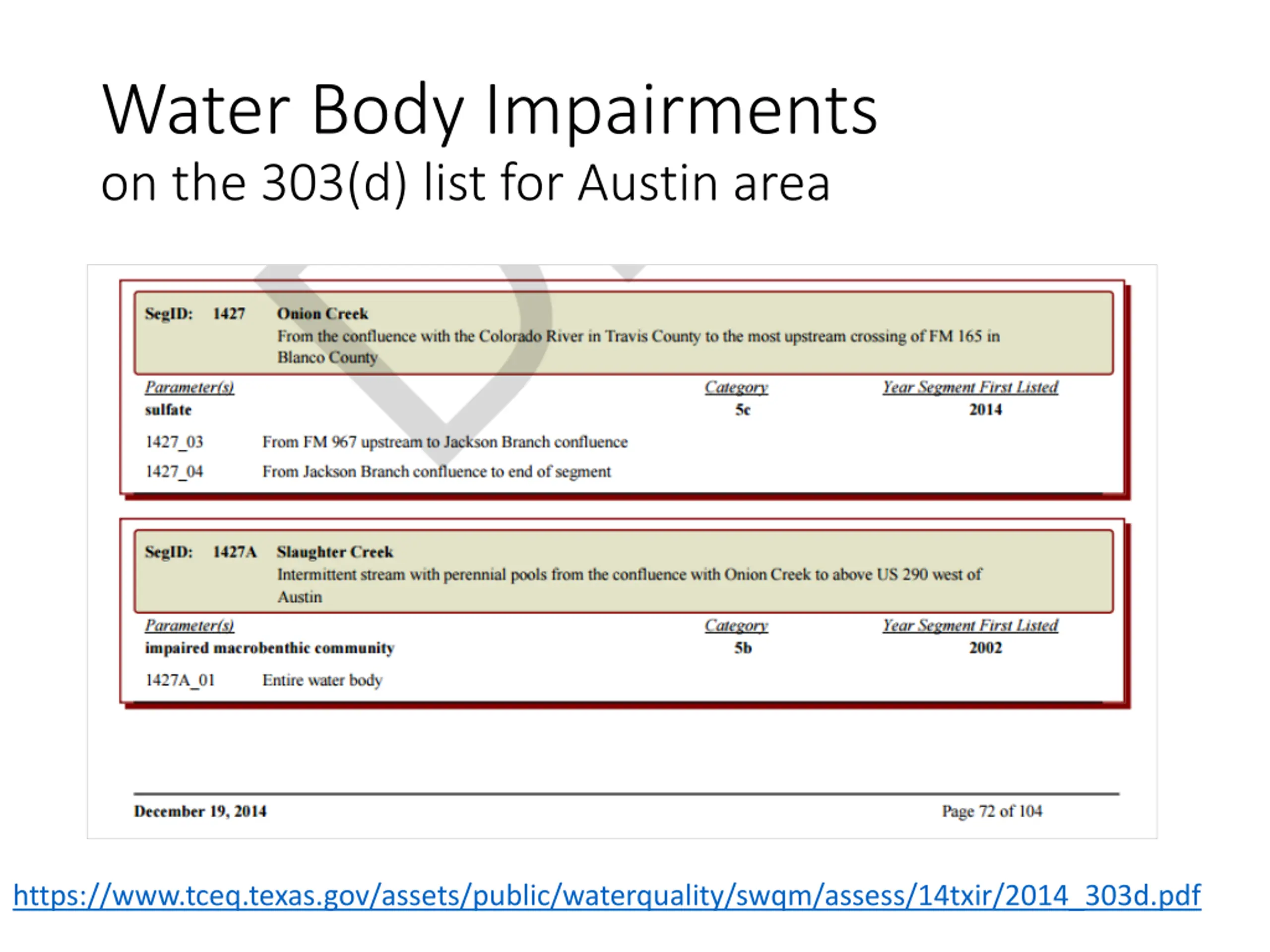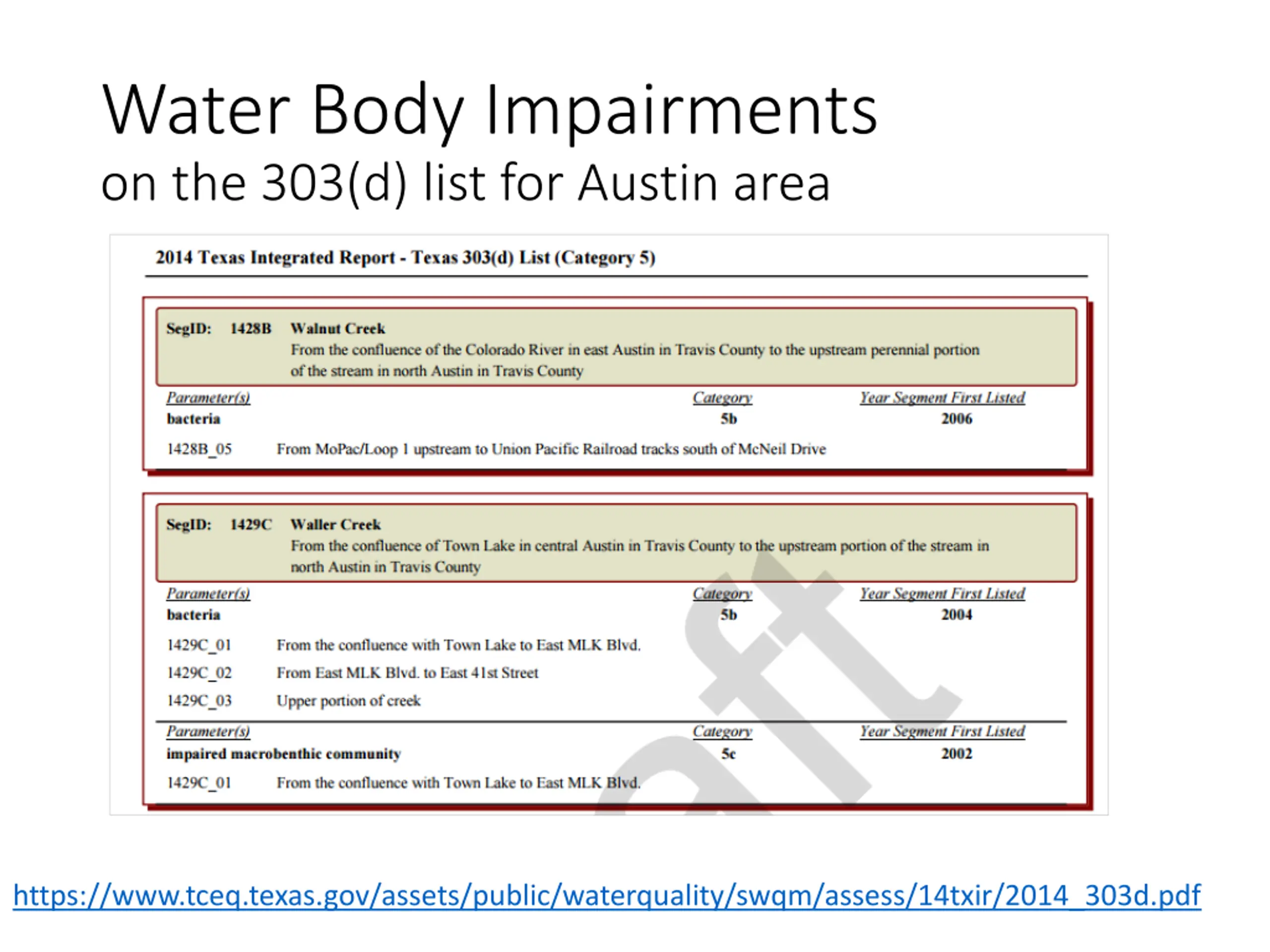Water Body Impairments on the 303(d) list for Austin area https://www.tceq.texas.gov/assets/public/waterquality/swqm/assess/14txir/2014_303d.pdf