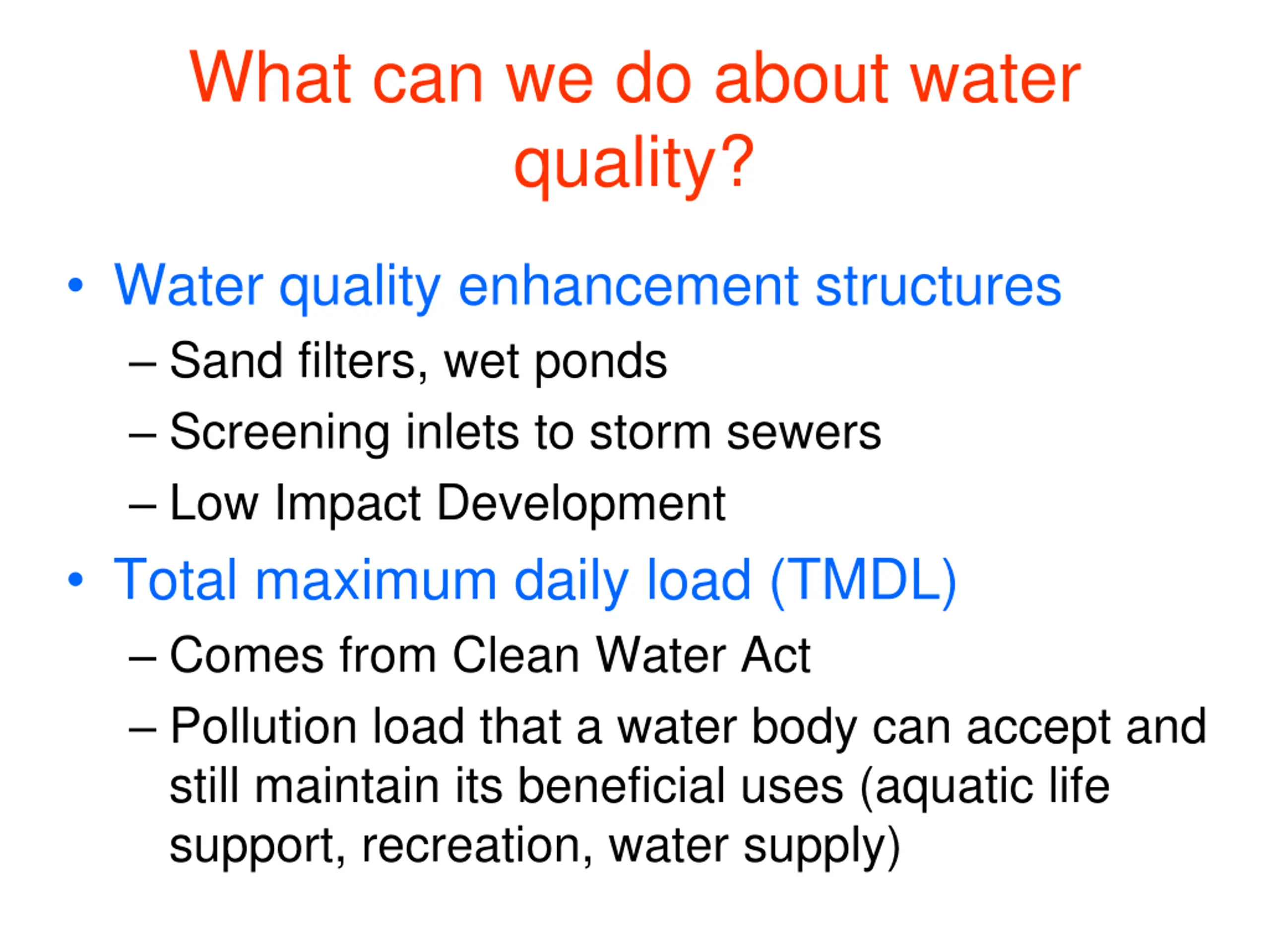 What can we do about water quality? Water quality enhancement structures Sand filters, wet ponds Screening inlets to storm sewers Low Impact Development Total maximum daily load (TMDL) Comes from Clean Water Act Pollution load that a water body can accept and still maintain its beneficial uses (aquatic life support, recreation, water supply)