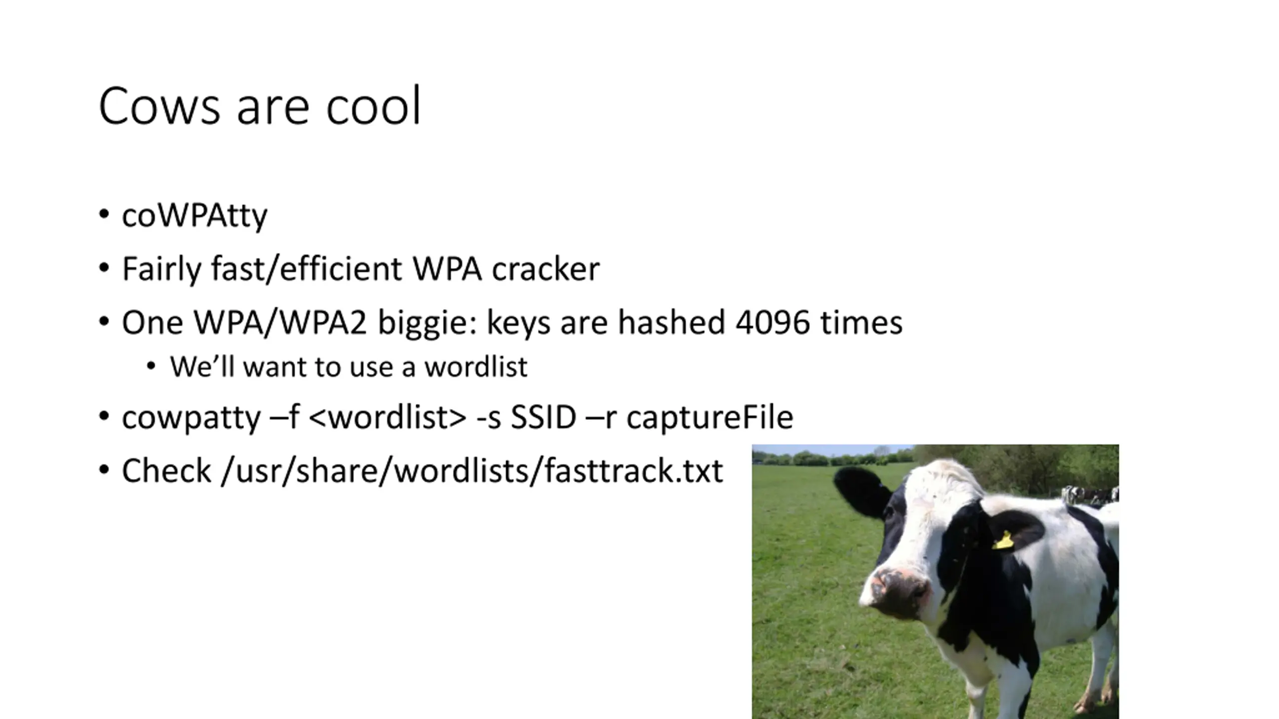 - Cows are cool coWPAtty Fairly fast/efficient WPA cracker One WPA/WPA2 biggie: keys are hashed 4096 times We ll want to use a wordlist cowpatty f <wordlist> -s SSID r captureFile Check /usr/share/wordlists/fasttrack.txt