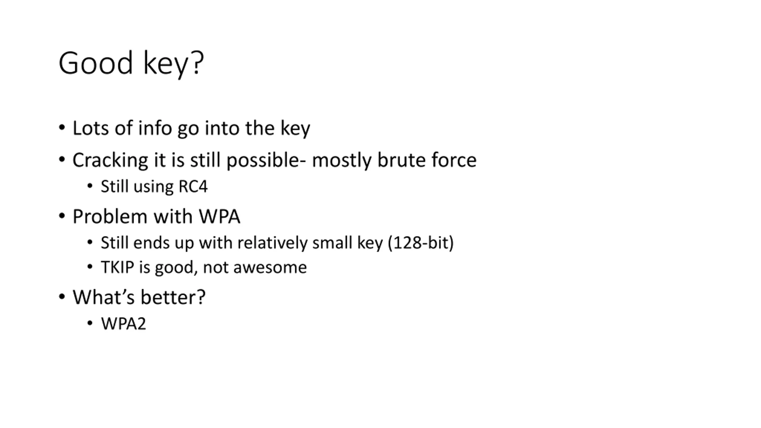 - Good key? Lots of info go into the key Cracking it is still possible- mostly brute force Still using RC4 Problem with WPA Still ends up with relatively small key (128-bit) TKIP is good, not awesome What s better? WPA2