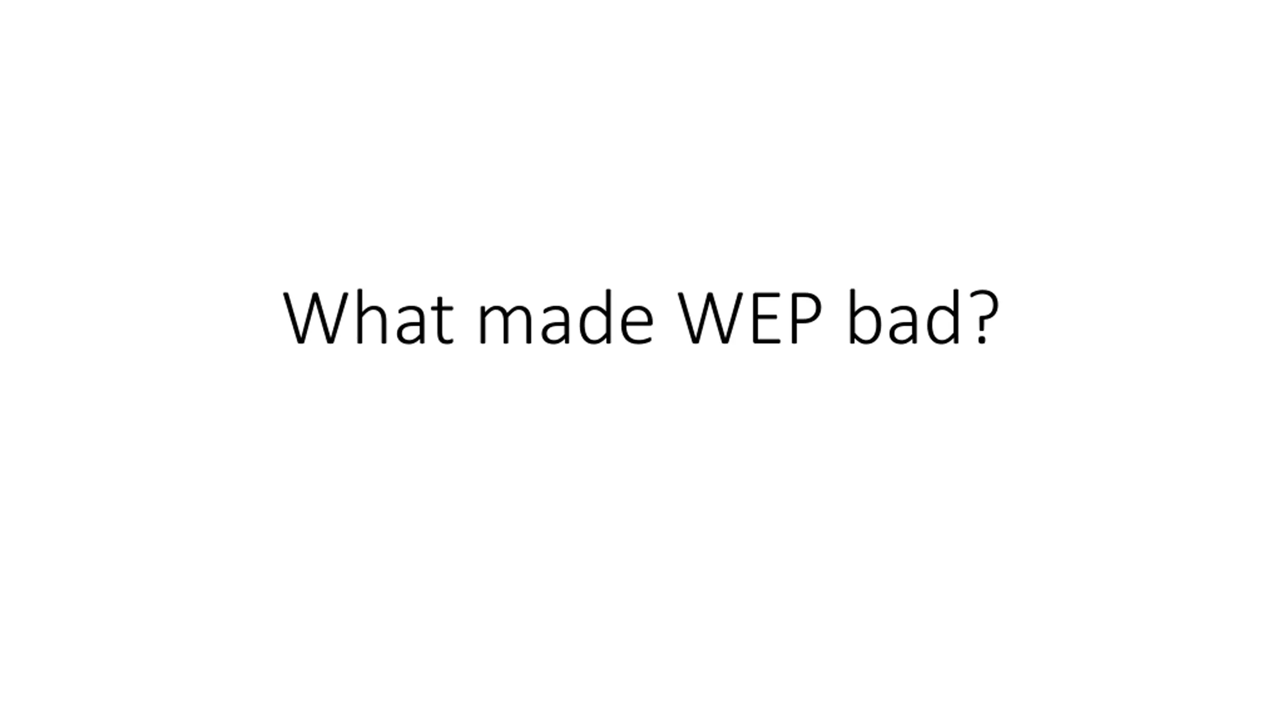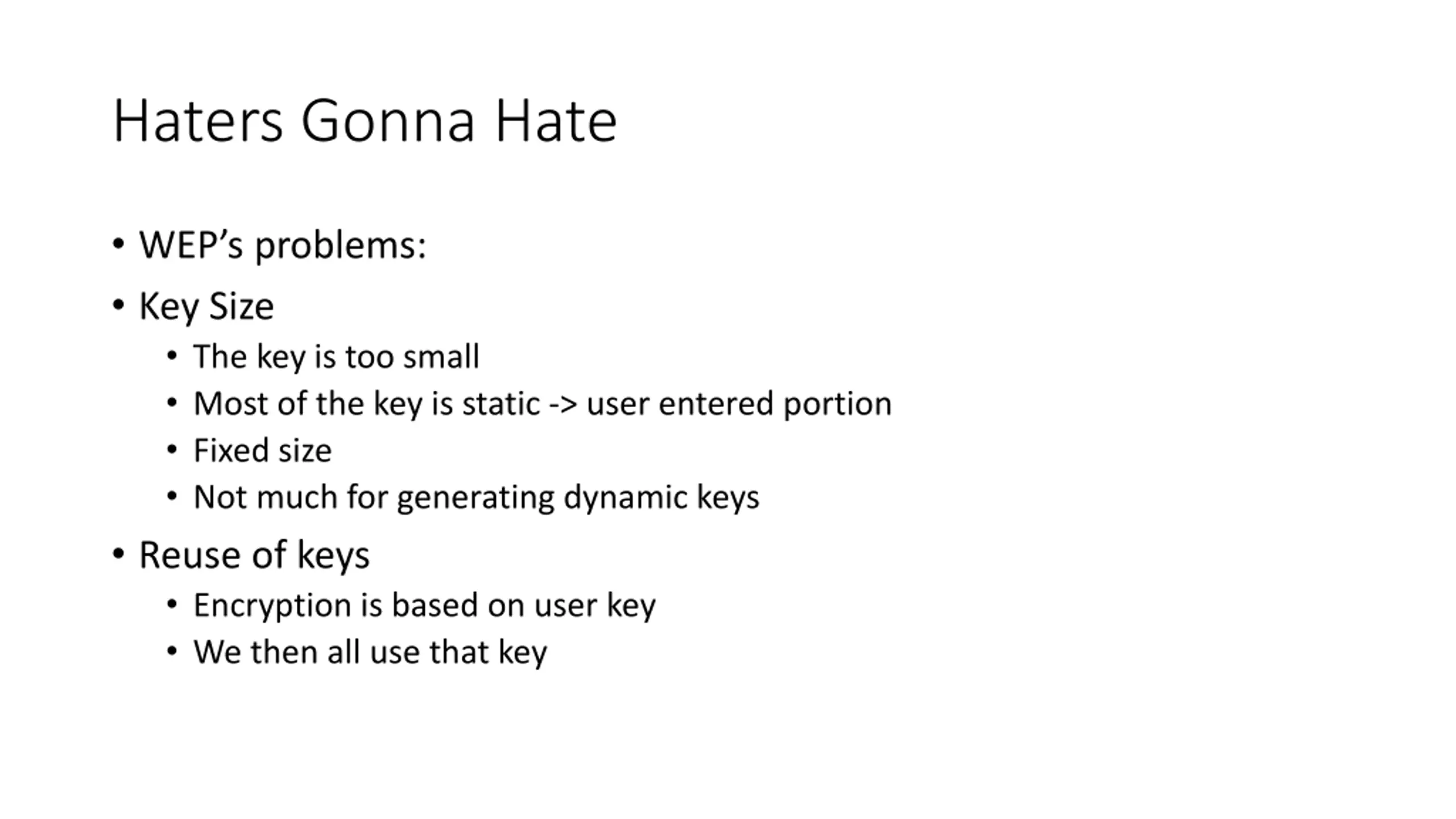 - Haters Gonna Hate WEP s problems: Key Size The key is too small Most of the key is static -> user entered portion Fixed size Not much for generating dynamic keys Reuse of keys Encryption is based on user key We then all use that key