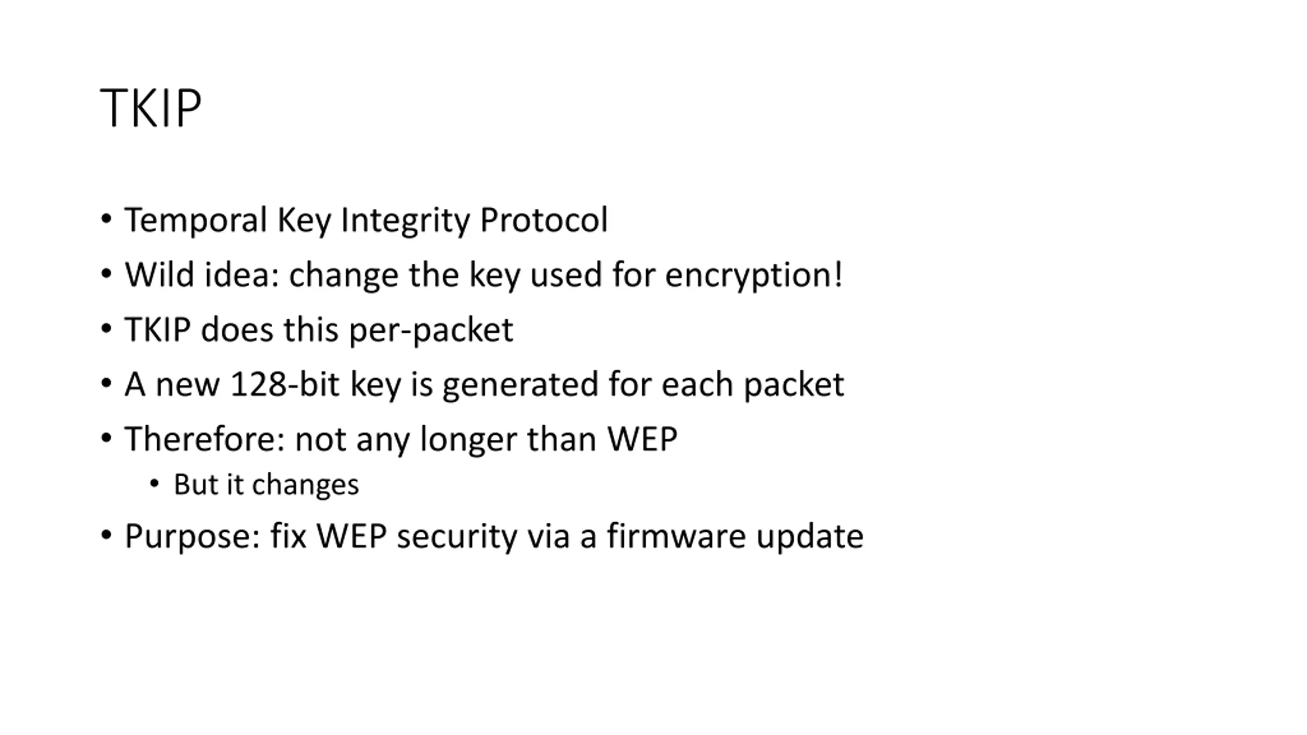 - TKIP Temporal Key Integrity Protocol Wild idea: change the key used for encryption! TKIP does this per-packet A new 128-bit key is generated for each packet Therefore: not any longer than WEP But it changes Purpose: fix WEP security via a firmware update