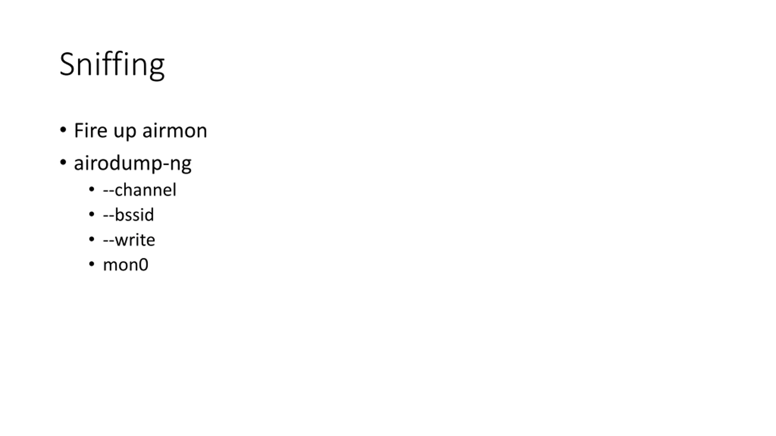 - Sniffing Fire up airmon airodump-ng --channel --bssid --write mon0
