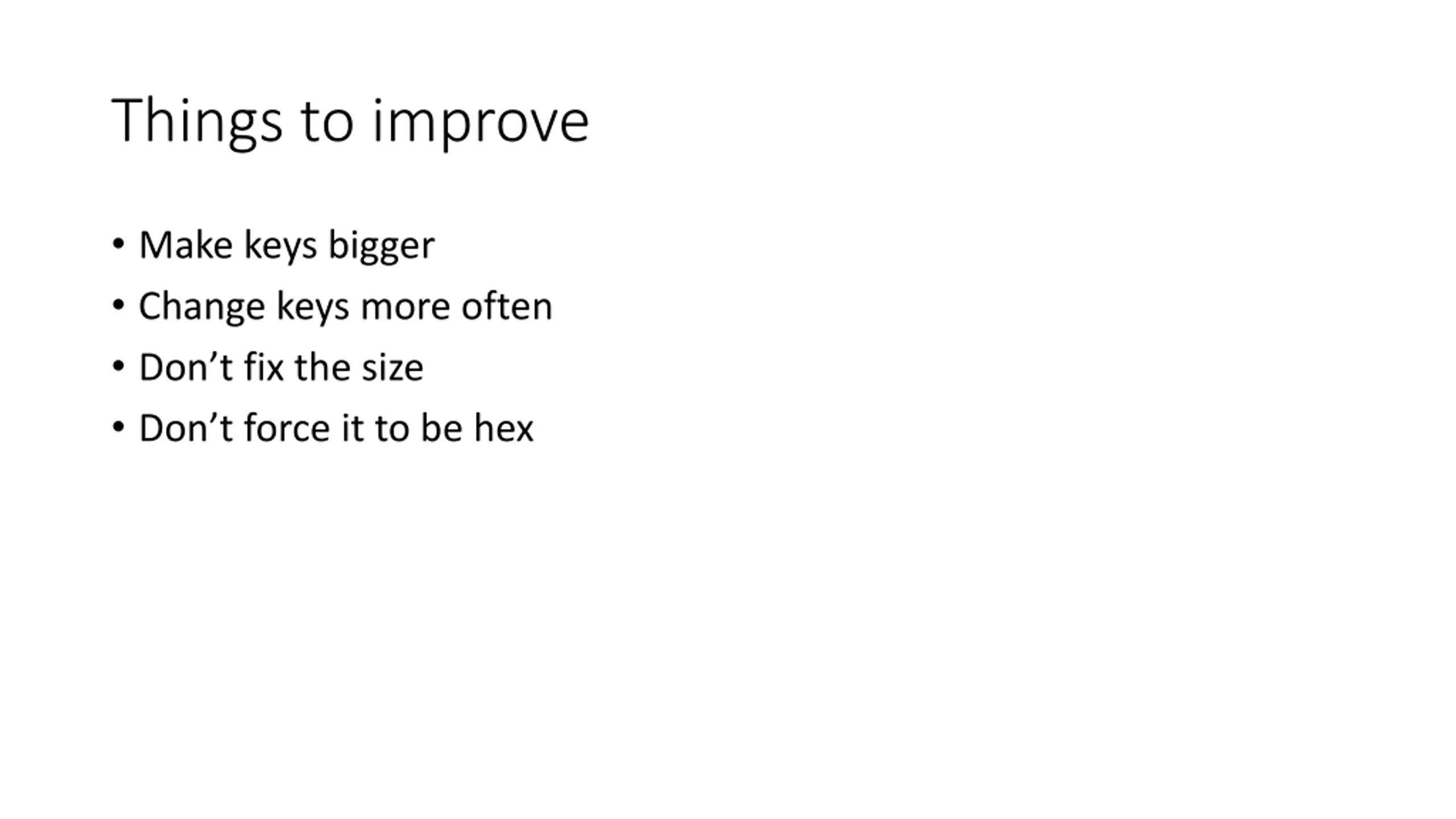 - Things to improve Make keys bigger Change keys more often Don t fix the size Don t force it to be hex