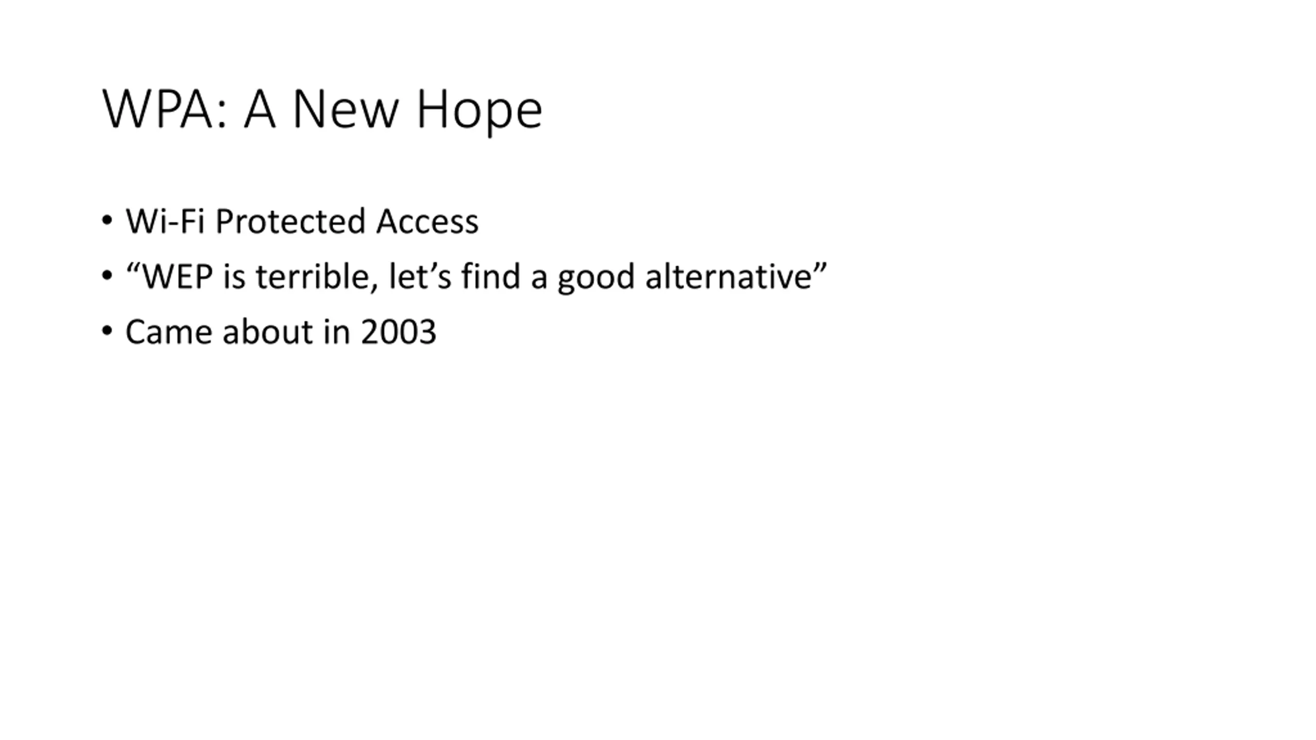 - WPA: A New Hope Wi-Fi Protected Access WEP is terrible, let s find a good alternative Came about in 2003
