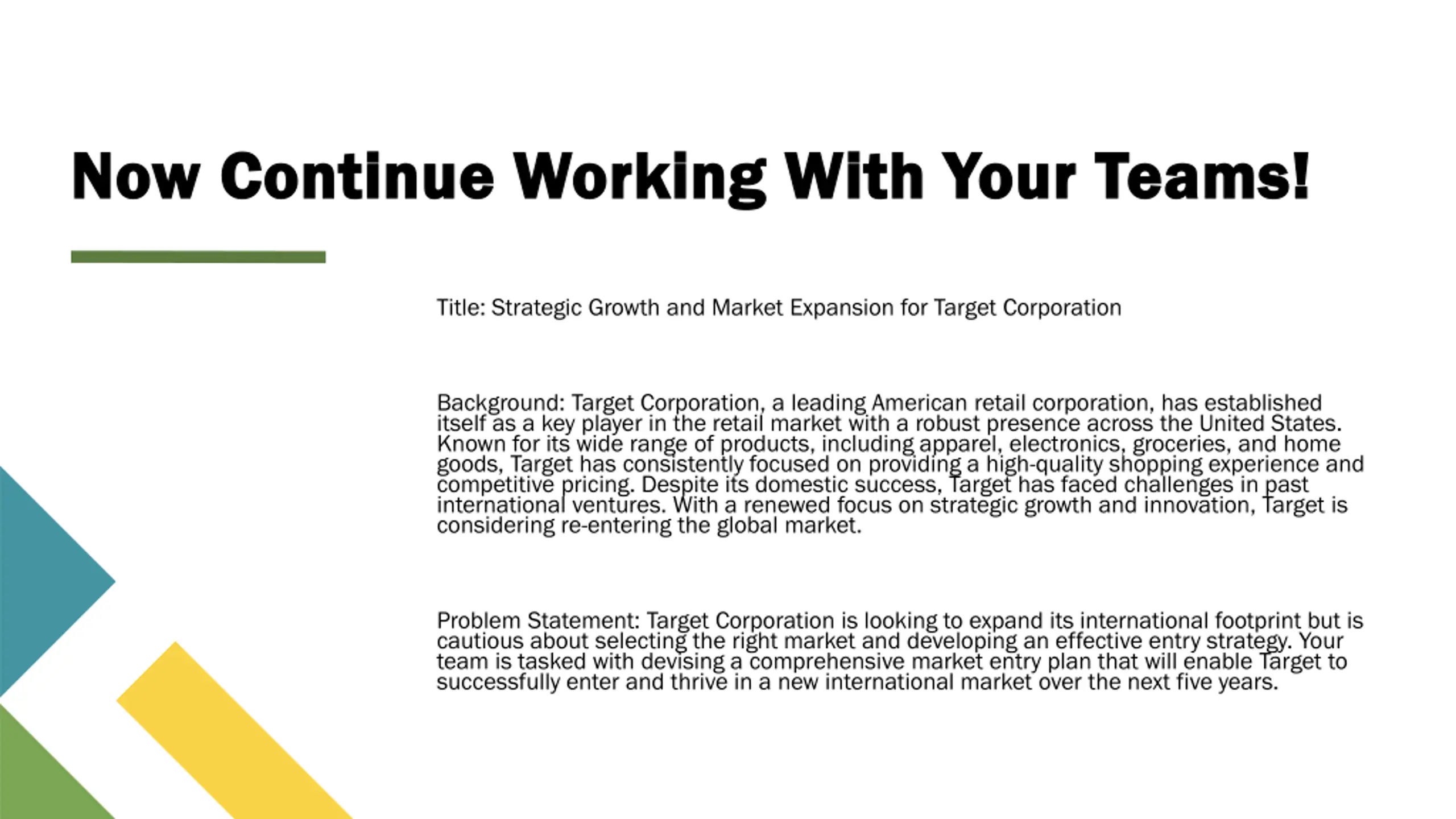 Now Continue Working With Your Teams! Now Continue Working With Your Teams! Title: Strategic Growth and Market Expansion for Target Corporation Background: Target Corporation, a leading American retail corporation, has established itself as a key player in the retail market with a robust presence across the United States. Known for its wide range of products, including apparel, electronics, groceries, and home goods, Target has consistently focused on providing a high-quality shopping experience and competitive pricing. Despite its domestic success, Target has faced challenges in past international ventures. With a renewed focus on strategic growth and innovation, Target is considering re-entering the global market. Problem Statement: Target Corporation is looking to expand its international footprint but is cautious about selecting the right market and developing an effective entry strategy. Your team is tasked with devising a comprehensive market entry plan that will enable Target to successfully enter and thrive in a new international market over the next five years.